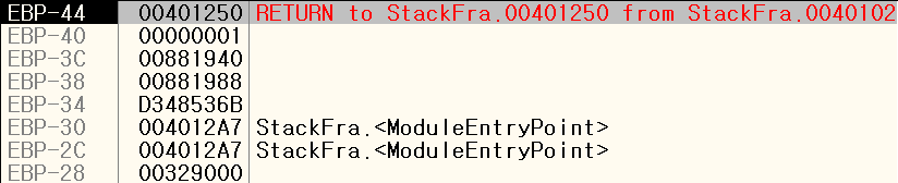 마지막으로 main() 함수가 종료(리턴)되면서 리턴 주소 (00401250)으로 점프합니다
