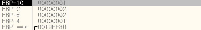 [EBP-8]에 있는 값은 b에 해당하는 2이며 [EBP-4]에 있는 값은 a에 해당하는 1입니다
