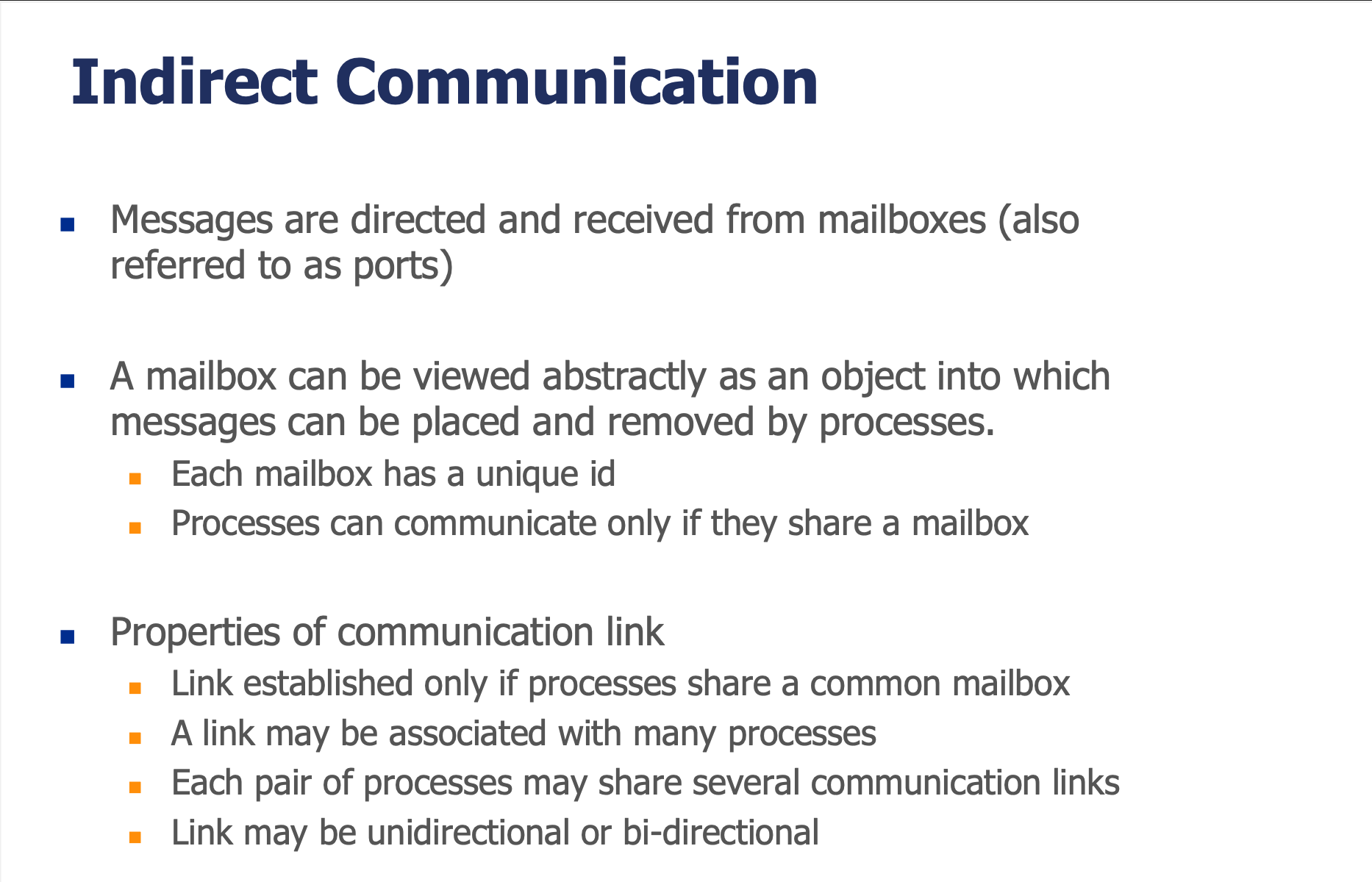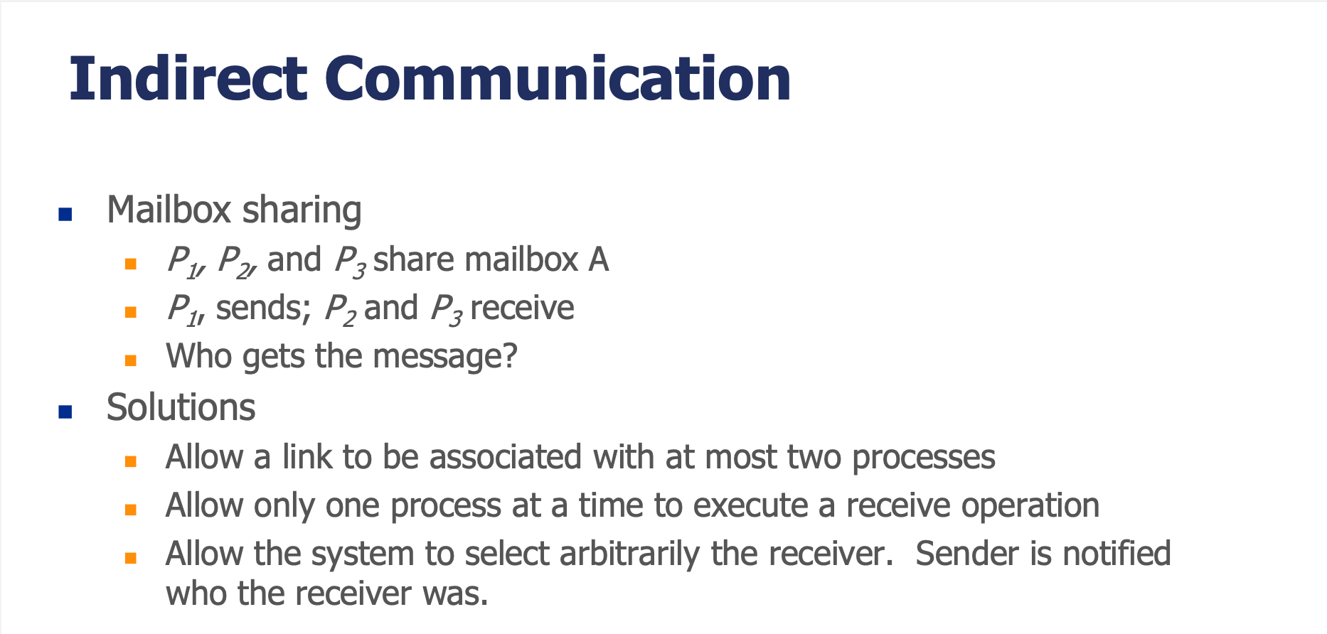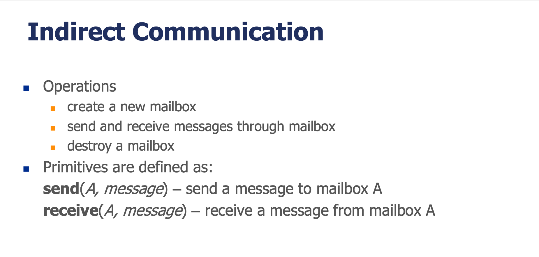 | Mailbox / Port | 간접 통신에서 메시지가 저장/인출되는 추상 객체 |