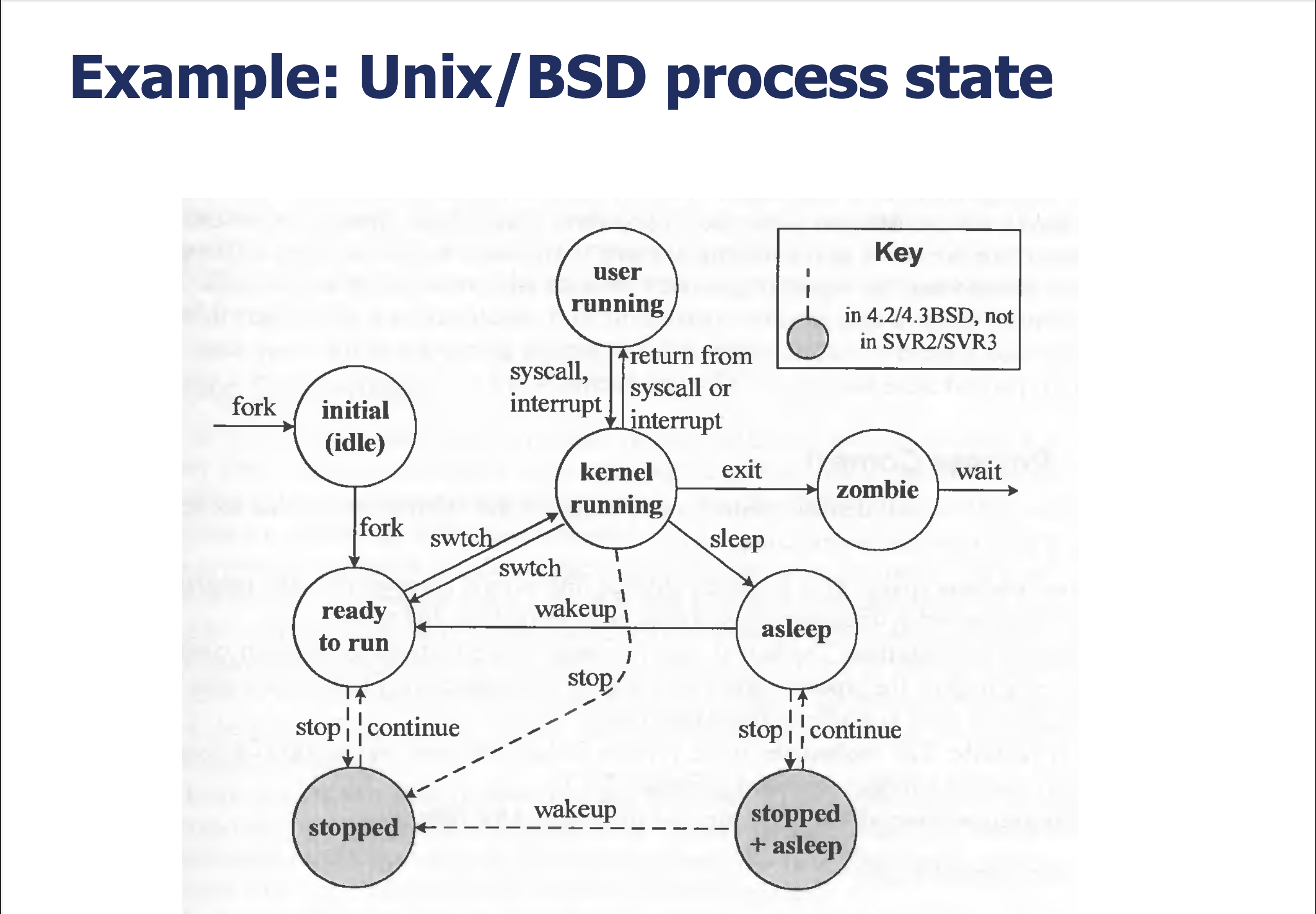 핵심 포인트: 실제 Unix에서는 user running과 kernel running을 구분하며, 좀비(zombie)와 정지(stopped) 상태가 추가된다. 좀비는 프로세스가 종료되었지만 부모가 아직 회수하지 않은 상태이다.