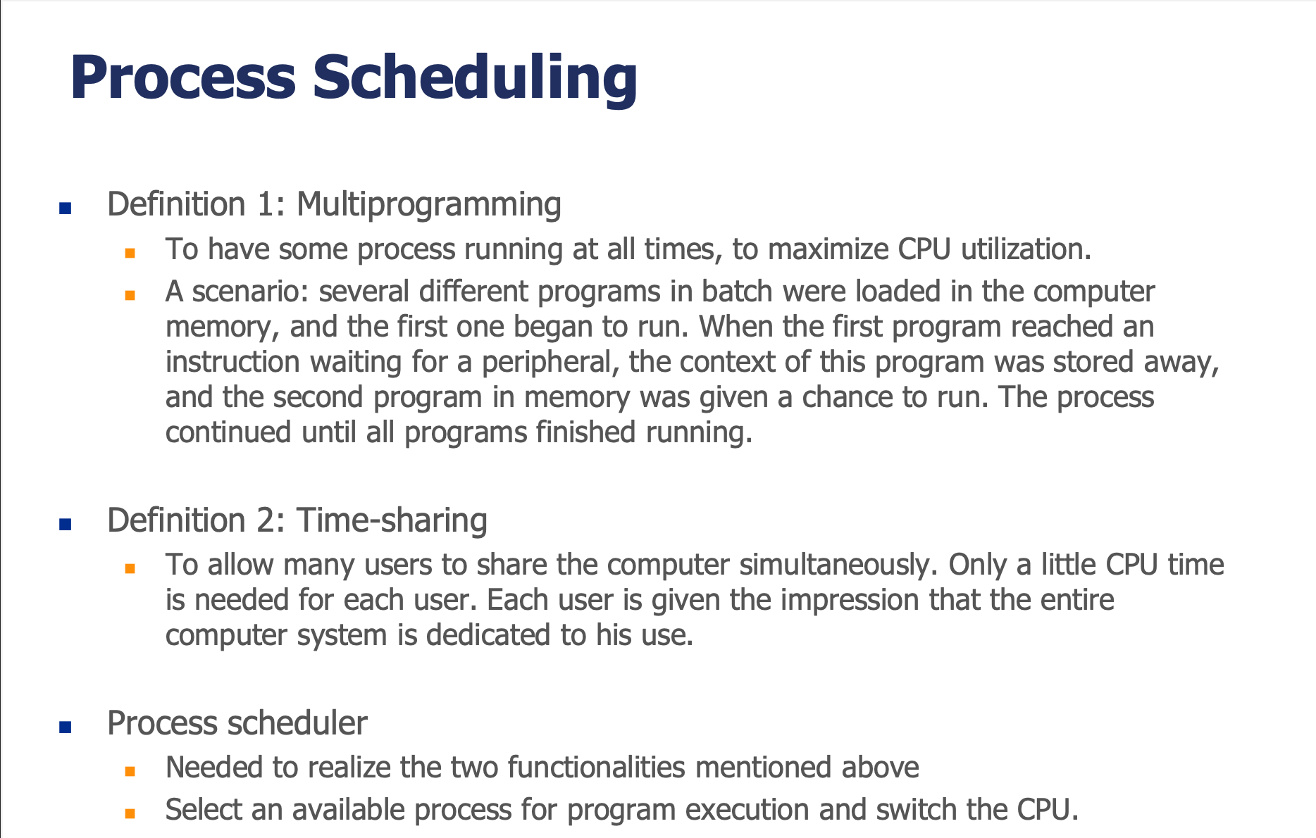 | 시분할 시스템 | 사용자 프로그램 또는 태스크(user programs or tasks) | 여러 사용자가 동시에 시스템을 공유하는 방식 |