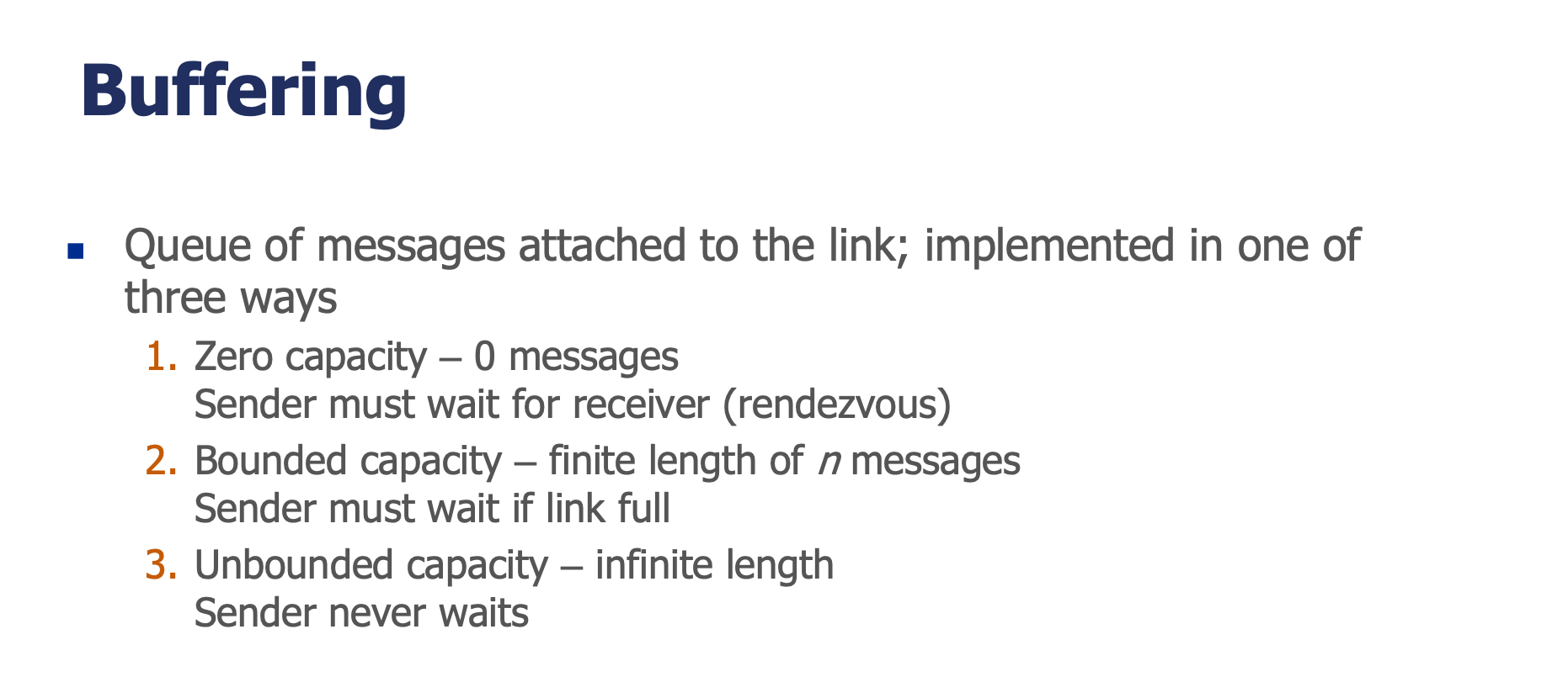 | Bounded capacity | Finite length of n messages. Sender must wait if link full | 유한 용량 n개. 링크가 가득 차면 송신자가 대기 | 최대 n개까지 메시지 저장 가능. 가득 차면 송신자가 차단됨 |