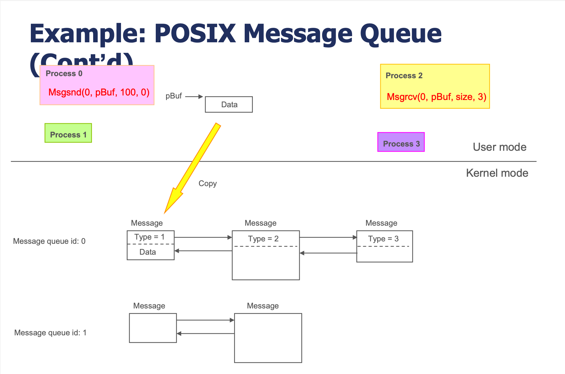 msgsnd()로 메시지를 보내면 사용자 공간의 데이터가 커널의 큐로 복사(copy)된다.msgrcv()로 메시지를 받으면 커널의 큐에서 사용자 공간으로 복사된다.