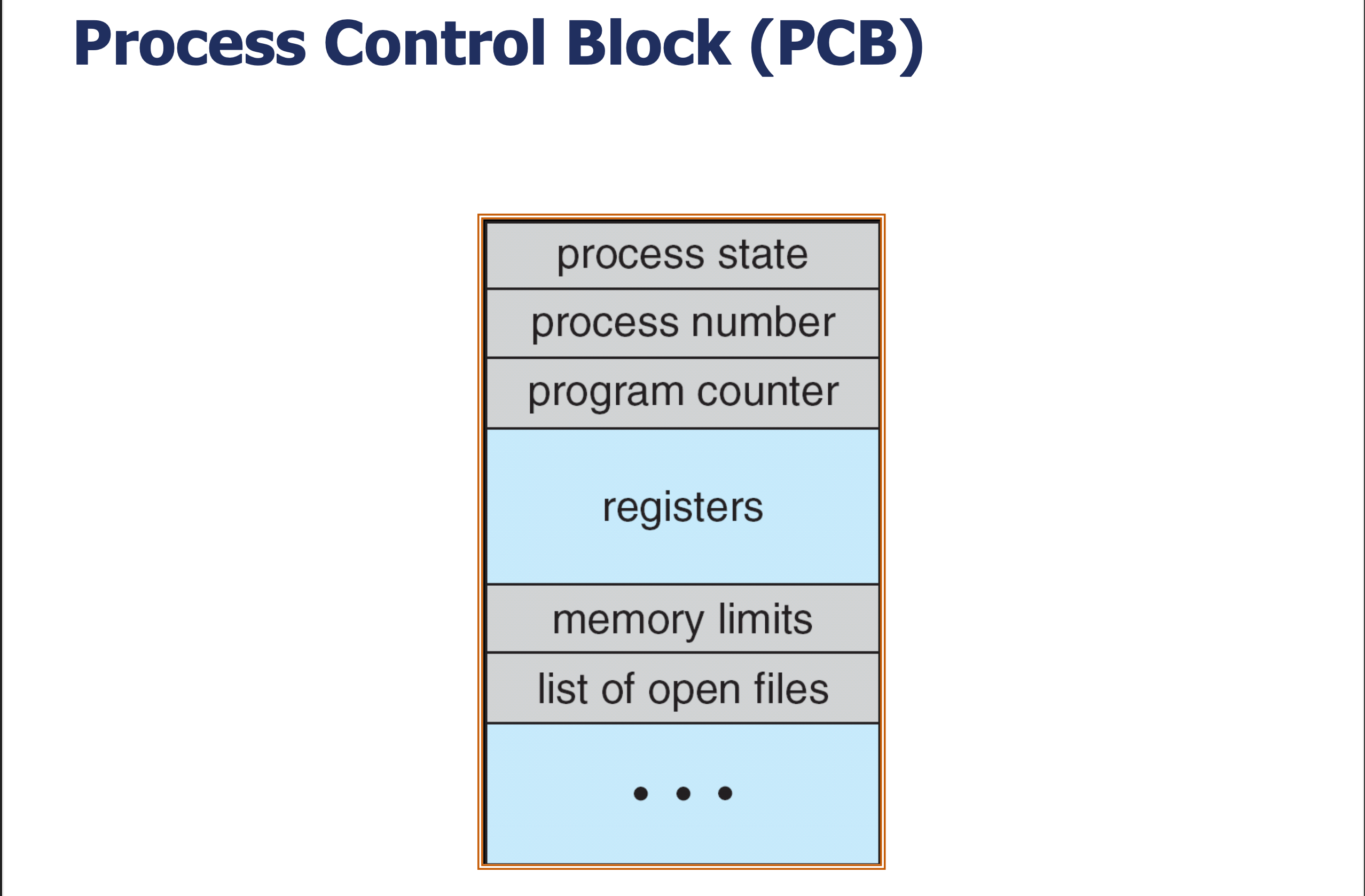 | process control block | 프로세스 제어 블록 | 레지스터, PC 등 하드웨어 문맥 |