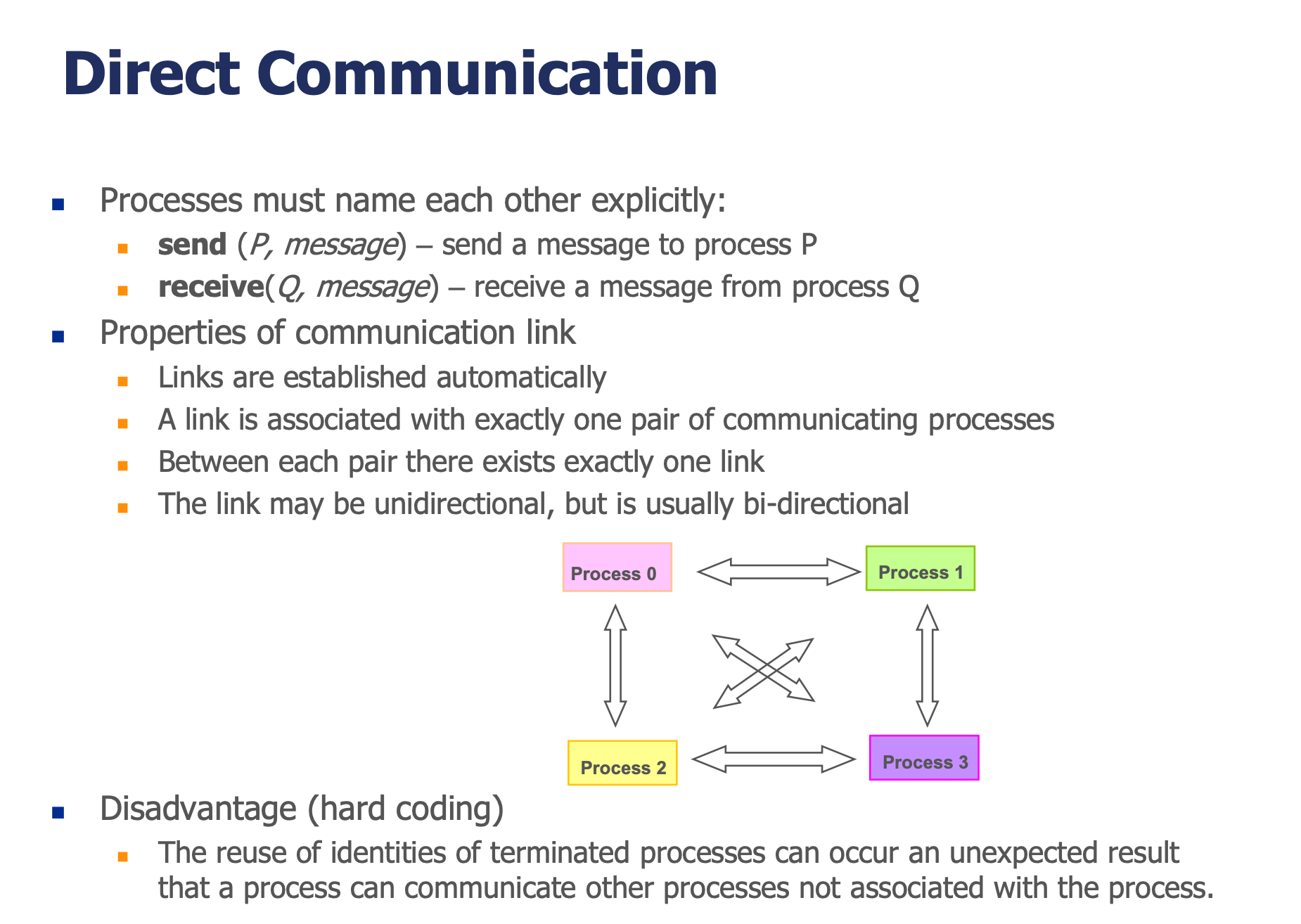 단점 (hard coding): 프로세스 식별자를 직접 지정하므로, 종료된 프로세스의 ID가 재사용되면 엉뚱한 프로세스와 통신할 수 있다.