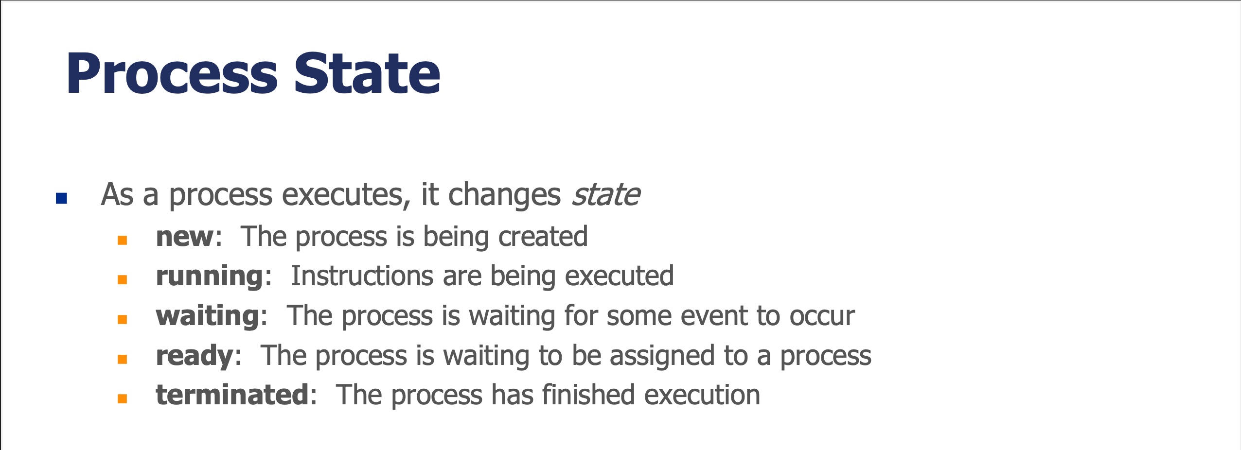 | ready | The process is waiting to be assigned to a processor | 프로세서에 할당되기를 기다리는 중 | 실행 준비가 되었지만 CPU가 다른 프로세스를 실행 중이라 대기 |