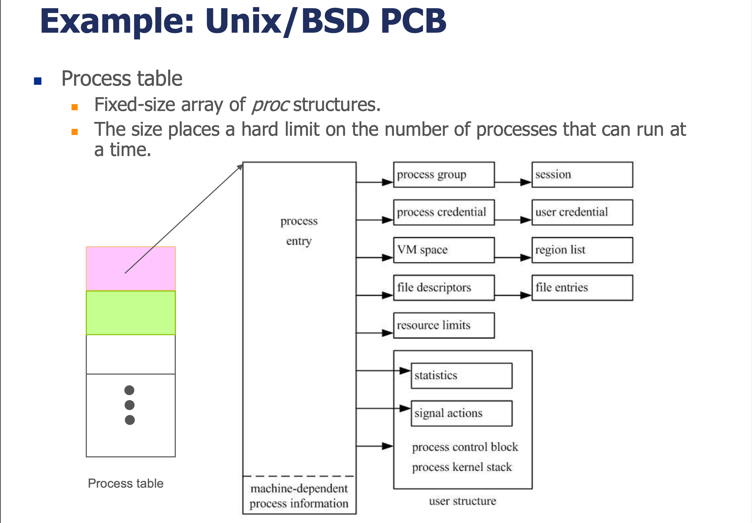 핵심 포인트: 실제 Unix에서 프로세스는 단순한 PCB가 아니라, 여러 하위 구조체들의 포인터 네트워크로 이루어져 있다. 프로세스 테이블의 크기가 최대 프로세스 수를 결정한다.