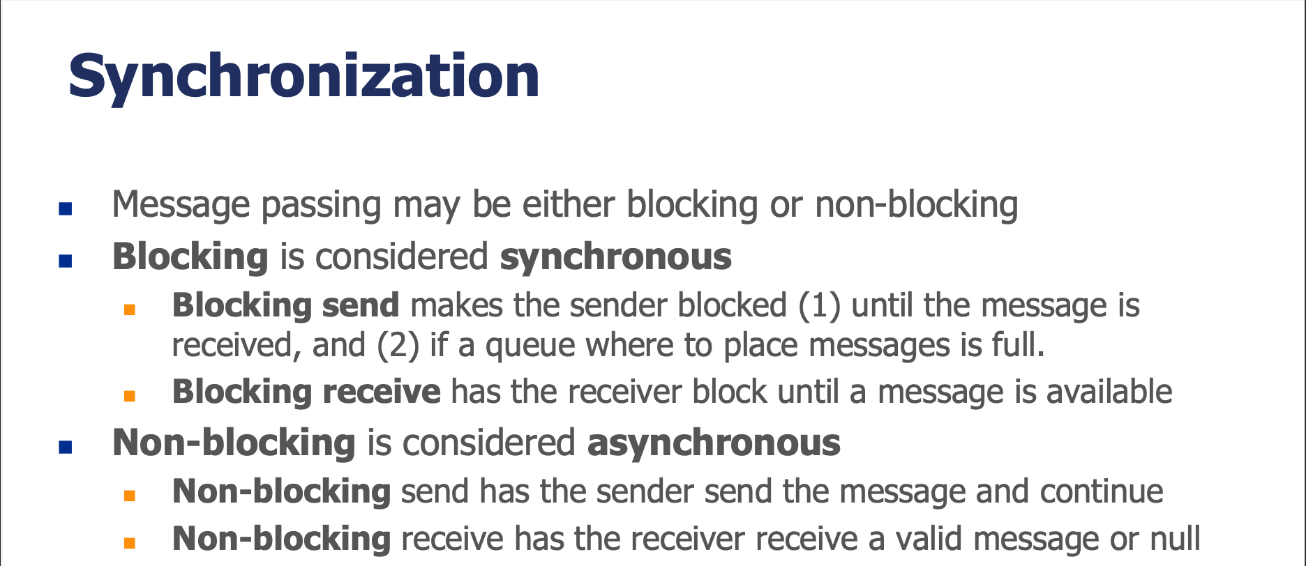 | Blocking receive | 메시지가 도착할 때까지 수신자가 차단 | 메시지가 올 때까지 기다린다 |