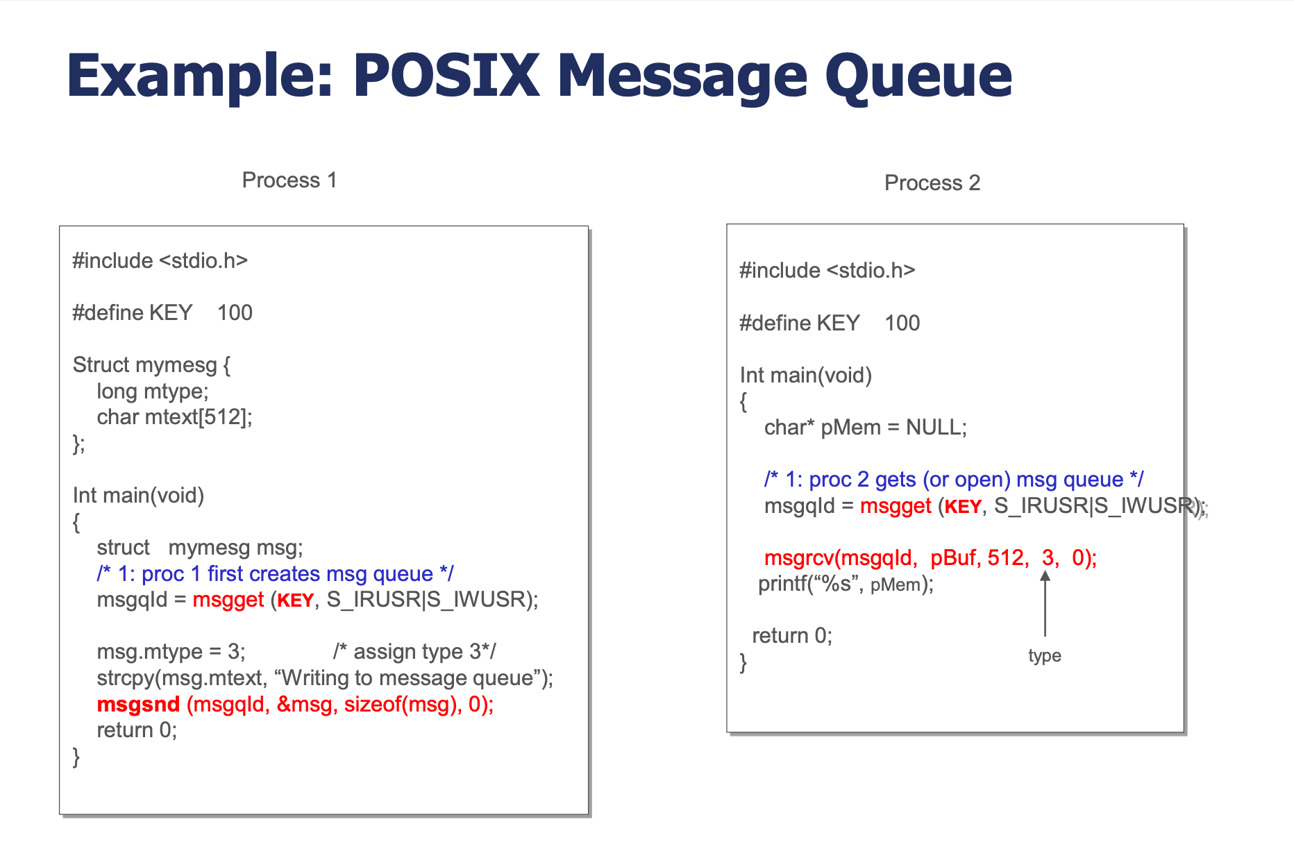 msgget(KEY, ...) | 메시지 큐 생성/열기 | KEY 값으로 메시지 큐를 식별. 없으면 생성, 있으면 열기 |