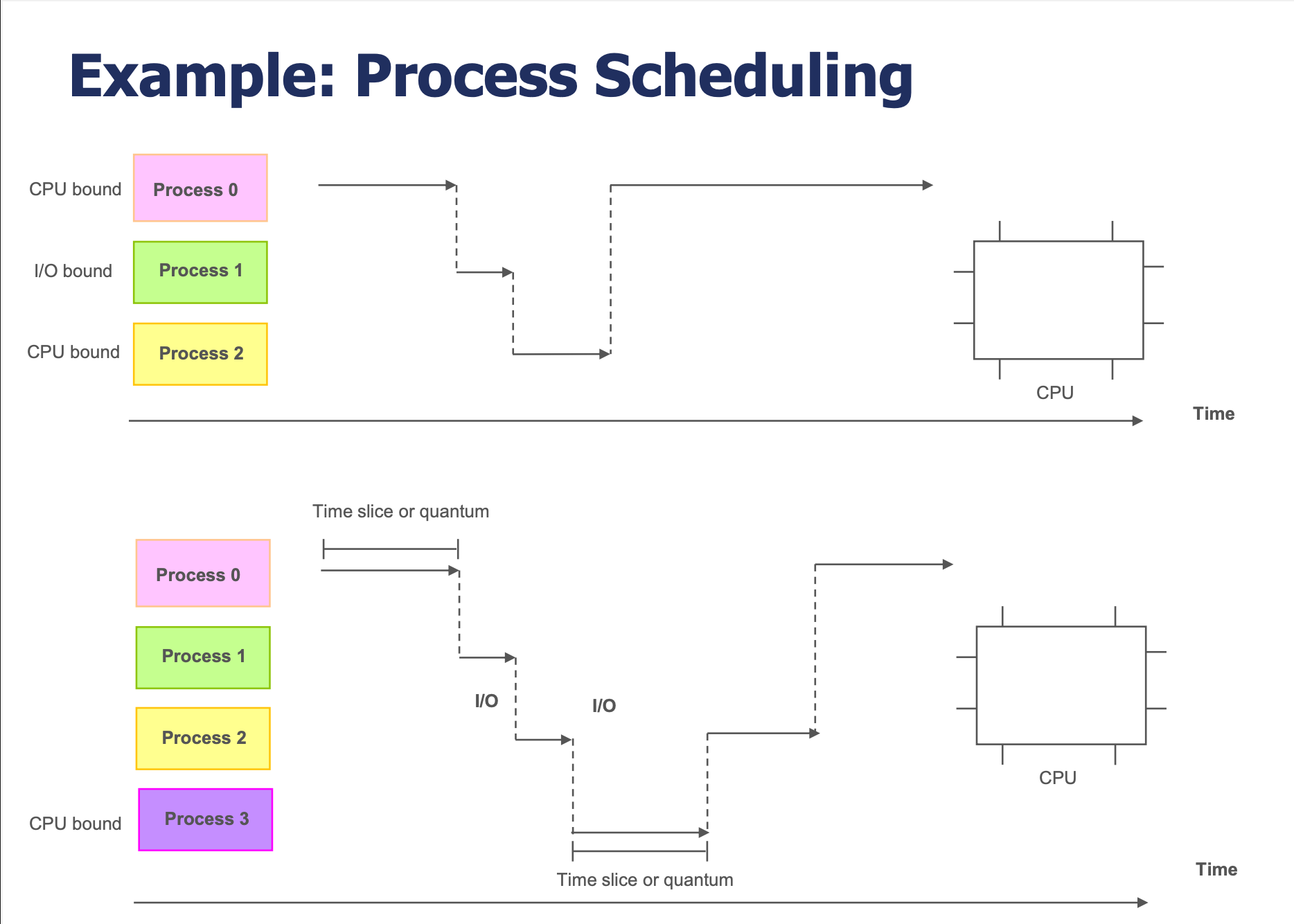 핵심 포인트: 다중프로그래밍은 I/O 대기 시 CPU를 다른 프로세스에 넘기는 것이고, 시분할은 정해진 시간 단위(타임 슬라이스)로 CPU를 번갈아 사용하는 것이다.