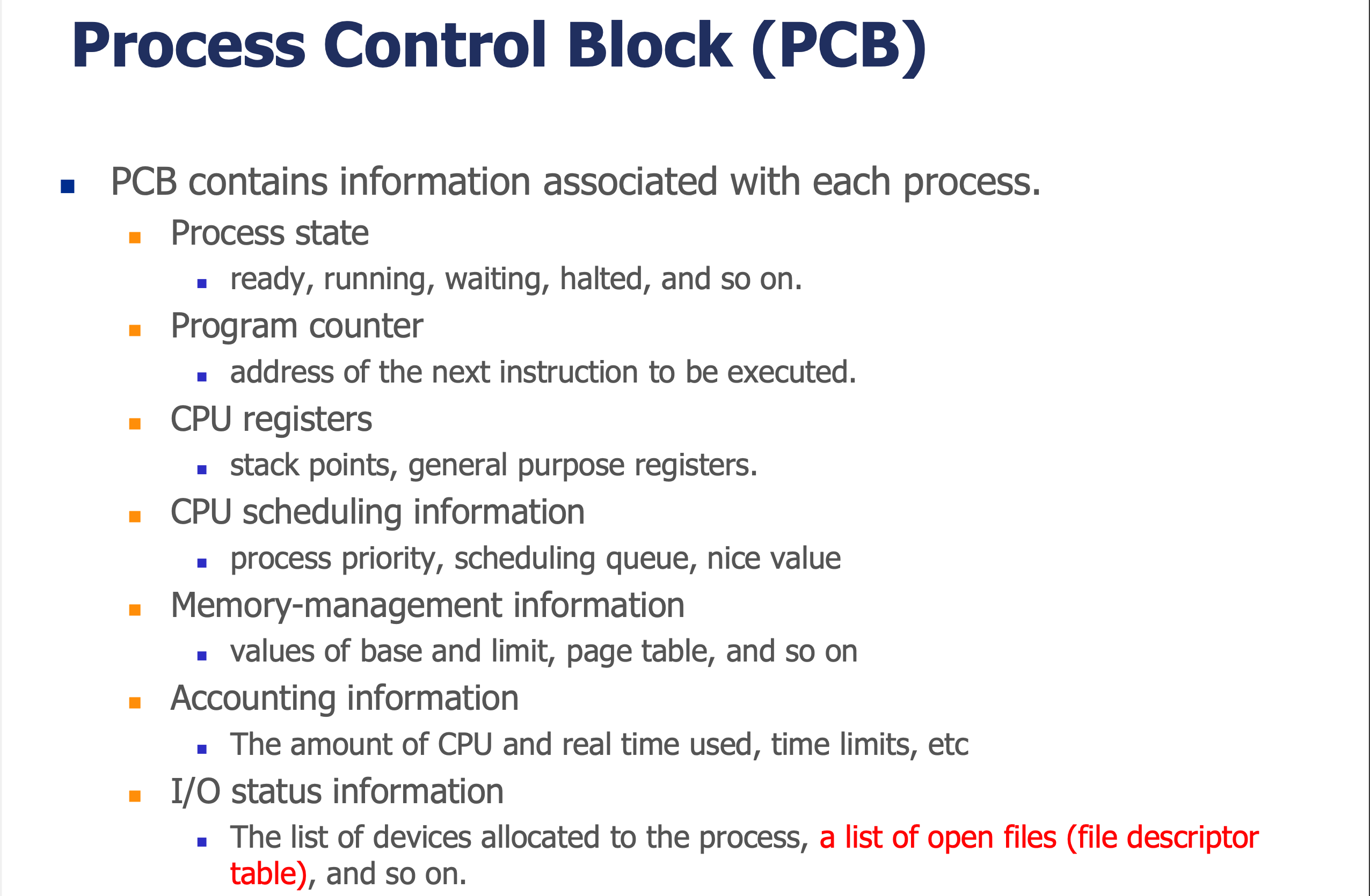 | I/O status information | The list of devices allocated to the process, a list of open files (file descriptor table) | I/O 상태 정보 | 할당된 장치 목록, 열린 파일 목록(파일 디스크립터 테이블) |