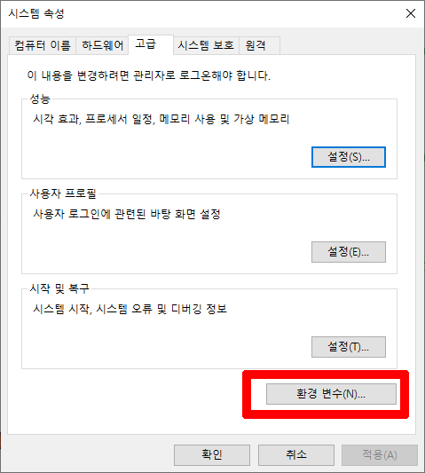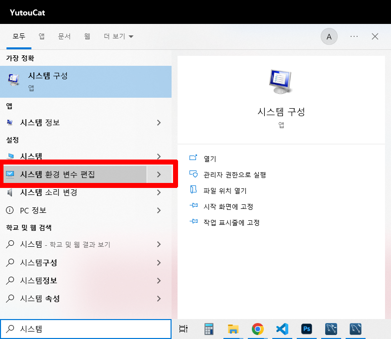 작업 표시줄의 검색창에 시스템을 입력해서 시스템 환경 변수 편집을 선택하기