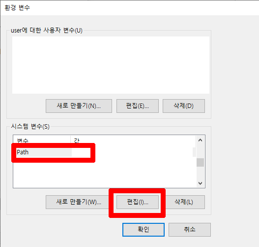 시스템 변수 -> Path를 선택 후 편집 누르기