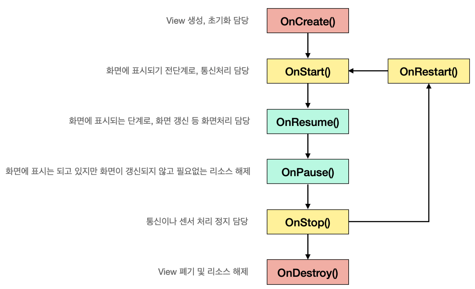 OnRestart는 조금 특이한 형태로, OnStop에서 사용자가 다른 액티비티를 호출하고 다시 돌아오는 경우 OnRestart가 호출된다. 그리고 OnStart-OnResume을 거쳐 사용자에게 화면을 다시 보여준다.