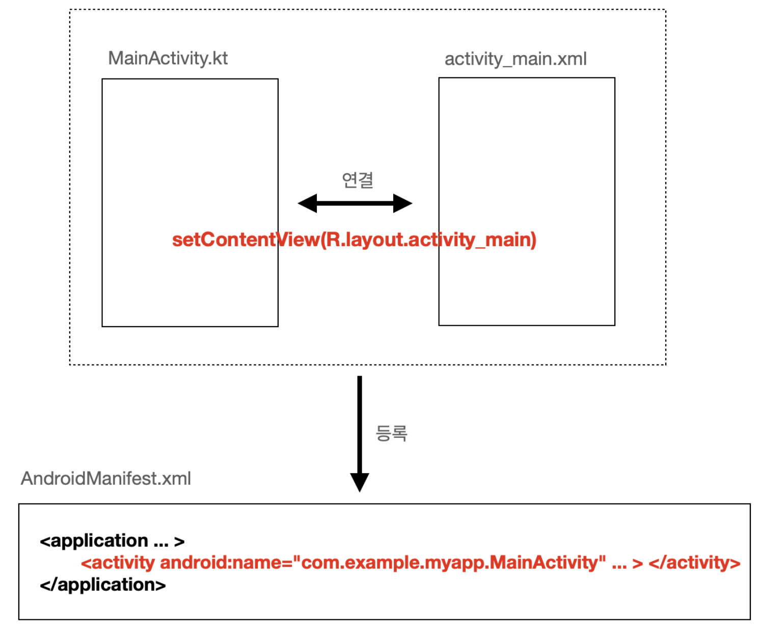 클래스 파일과 xml파일을 생성했다면, 클래스 파일과 xml파일을 연결해줘야 한다. 위 그림과 아래 코드들은 MainActivity.kt파일과 activity_main.xml파일을 만들었다고 가정한다. MainActivity.kt와 activity_main.xml파일을 연결하려면 MainActivity.kt의 onCreate메서드 안에 setContentView(R.layout.activity_main) 코드를 넣어주면 된다.
