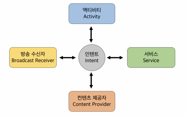 안드로이드 앱을 구성하는 네 가지 구성요소에는 Activity, Service, Broadcast Receiver, Content Provider가 있다.