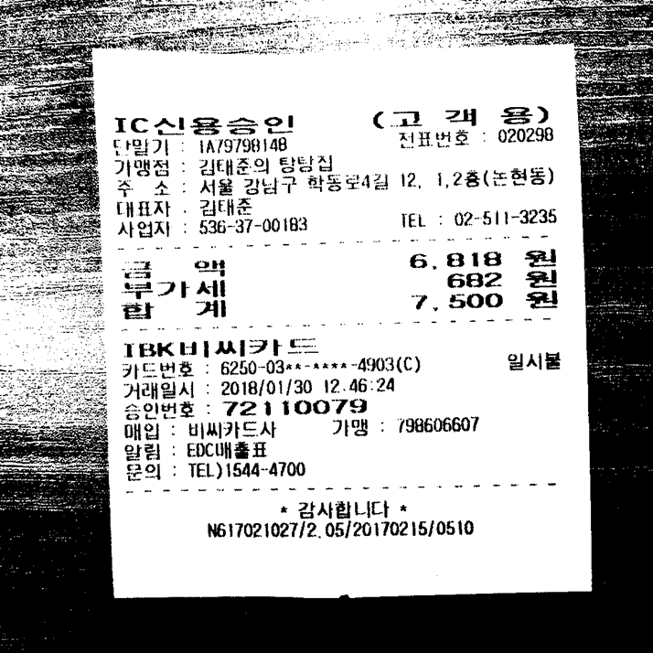 이 과정을 통해 배경에 흩어져 있는 잡음은 효과적으로 제거되면서도, 글자의 형태는 무너뜨리지 않고 되살릴 수 있었다. 특히 영수증처럼 저해상도에 글자 간격도 좁은 이미지에서는 단순한 필터링보다 이런 형태 기반 연산이 더 안정적인 결과를 주었고 덕분에 Tesseract가 더 깔끔한 입력을 받아서 인식률이 눈에 띄게 상승했다.