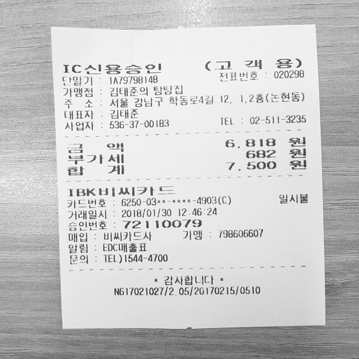 사용자는 가게 후기를 작성하기 위해 카메라를 통해 영수증 사진을 촬영해 서버로 전송한다. 서버는 사진에서 결제일시와 사업자번호 정보를 추출한 다음, '도용 방지를 위해 3일 이내에 소비한 영수증으로만 인증 가능', '중복 제보 방지를 위해 한 가게는 30일마다 인증 가능' 등 비즈니스 로직 제약사항에 적합한 영수증인지 확인한다.