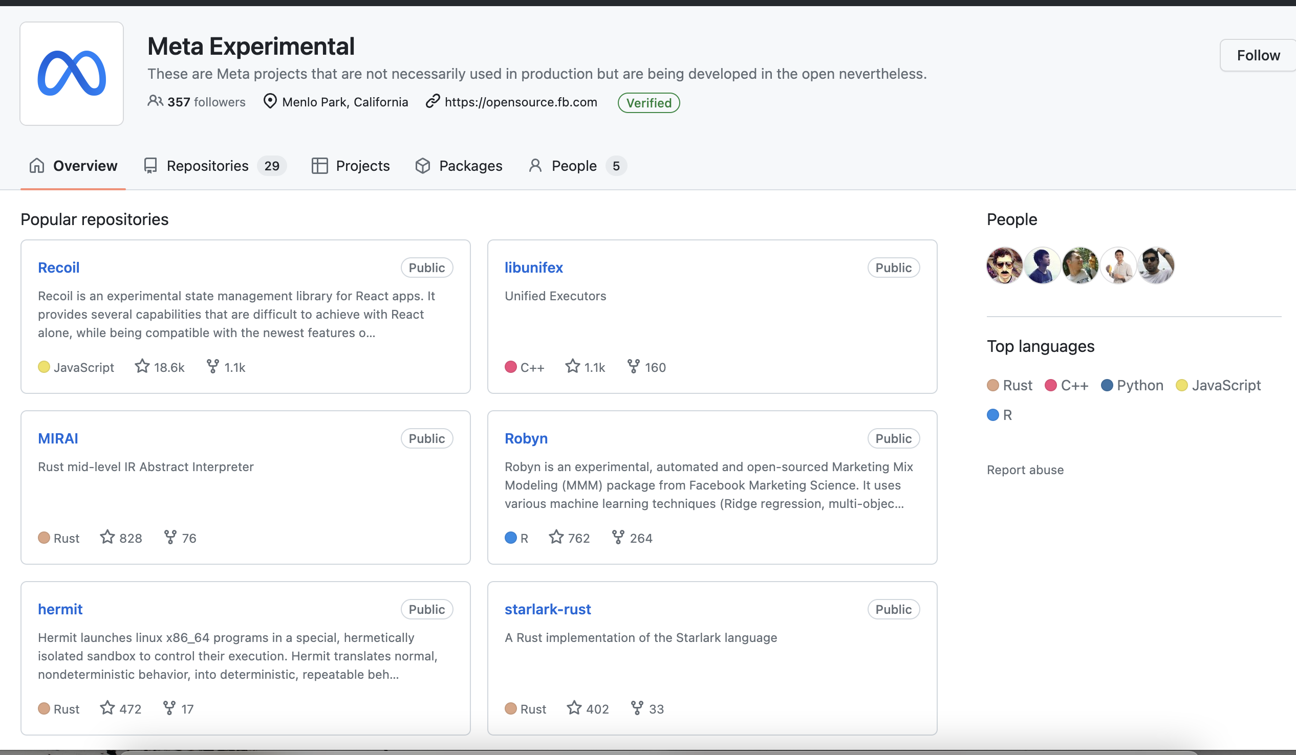 내가 기존에 meta가 만들었다는 것을 알고 있던 것들은 React, React-Native, Recoil 정도인 것 같다. 그런데, 사실 꽤나 유명한 오픈소스들이 더 존재하는데, 프론트 관련한 것들만 추려보면 다음과 같다.