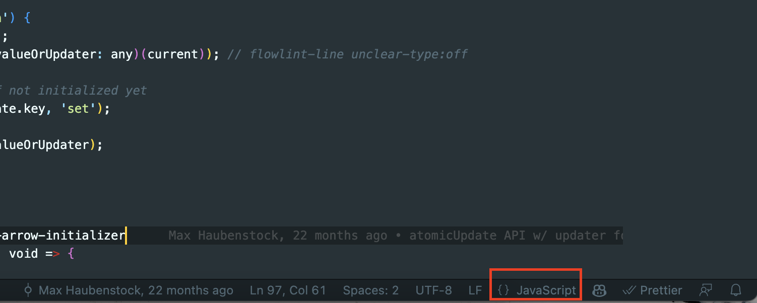 이는 language 모드를 js에서 ts로 바꿔주는 편법을 사용할 수 있는데, 오른쪽 아래 빨간 네모를 친 버튼을 눌러 ts로 바꿔준다.