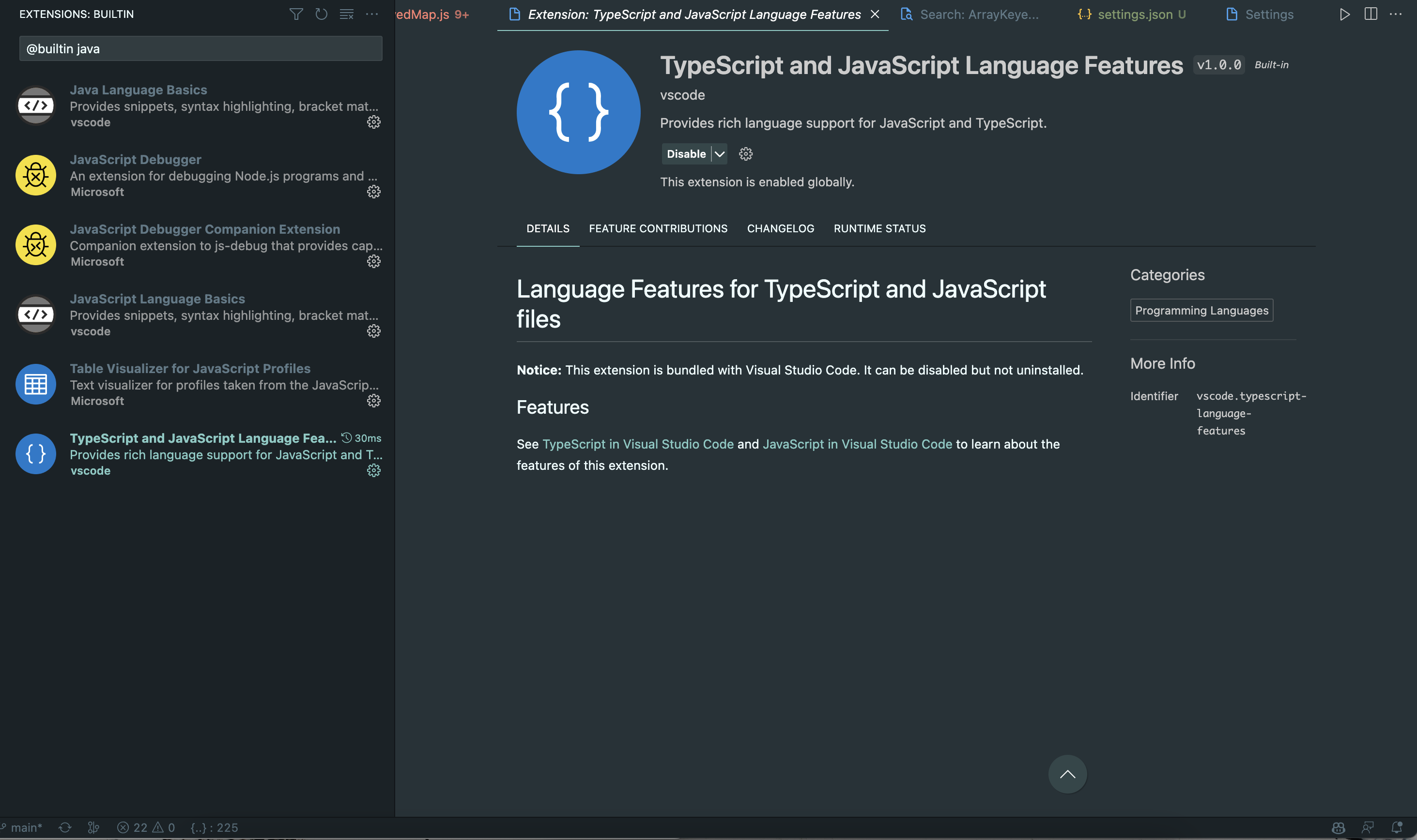 그래서 다른 방안으로 built-in extension에서 TypeScript and JavaScript Language Features 를 disable 처리해줬다.