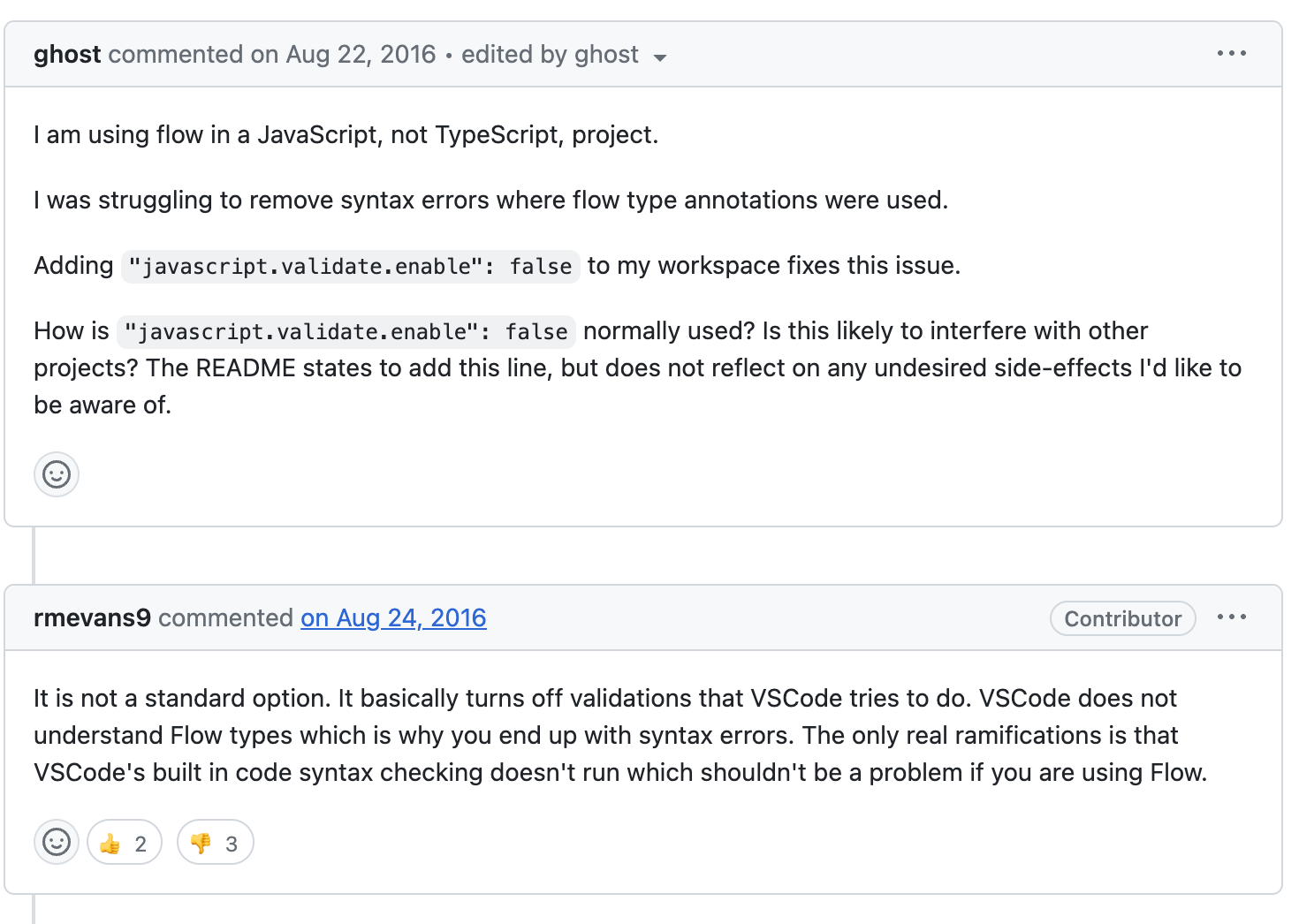 해당 링크의 위 내용을 보면, "javascript.validate.enable": false 옵션은 표준 옵션이 아니라고 한다. 그리고 중요한 것은 VS Code의 코드 검사 기능을 막는다는 것인데, 아래 내용을 보자.