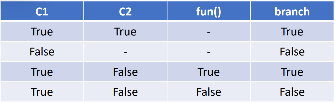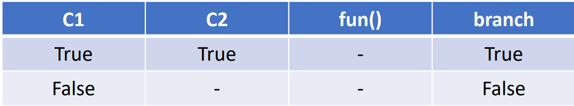 이때 다시 예시 코드로 돌아가보면, {(C1: true, C2: true), (C1: false)}와 같은 테스트 케이스만 있어도, branch Coverage는 100%가 된다. True와 False 결과를 모두 가질 수 있기 때문이다. 하지만 이 상황에서 fun()은 실행 자체가 되지 않는다.