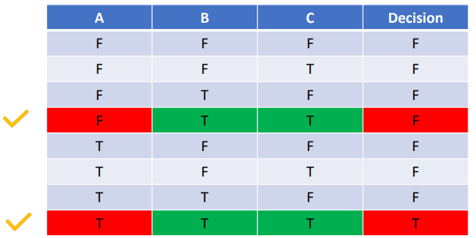 원래 Multiple Condition Coverage를 100% 충족시키려면, 총 8개의 테스트 케이스가 필요하다. 하지만 위 MC/DC의 결과를 보면 4개의 테스트 케이스면 충분하다고 말한다.