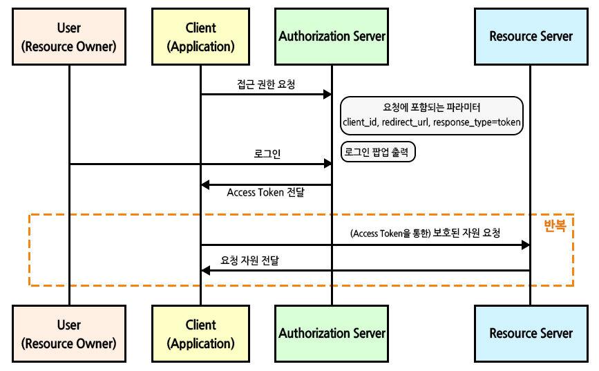 - 장점 : Access Token을 획득하기 위한 절차가 간소화되기에 응답성과 효율성은 높아지지만