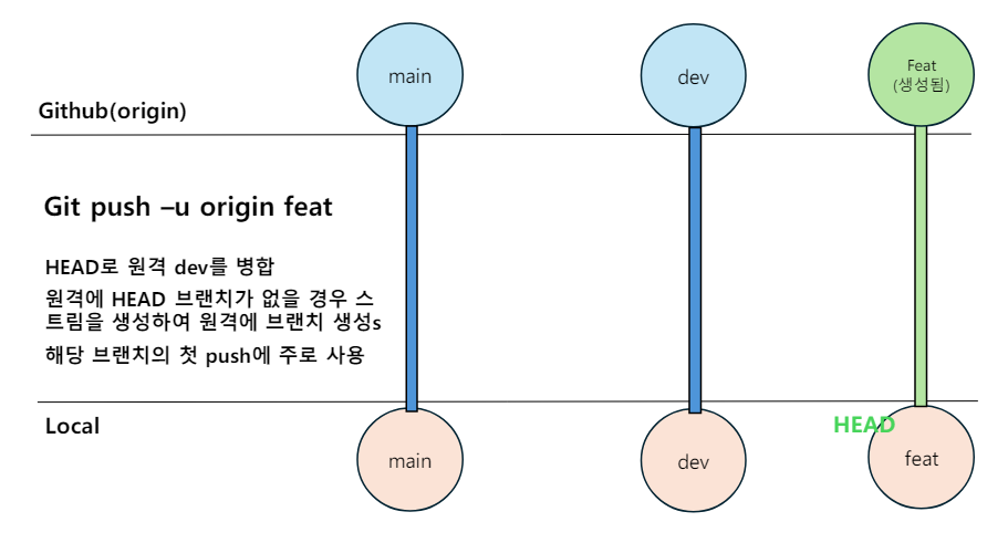 만약 원격에 HEAD와 같은 브랜치가 없다면 -u옵션으로 스트림을 만들어 원격에도 HEAD브랜치를 추가해준다.