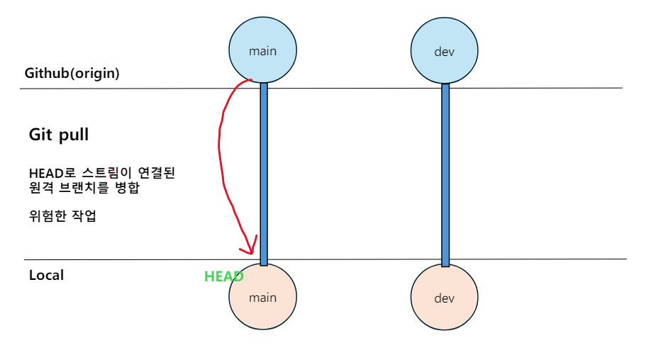 git pull만 사용시 현재 HEAD에 Stream이 연결된 원격 브랜치를 병합한다.