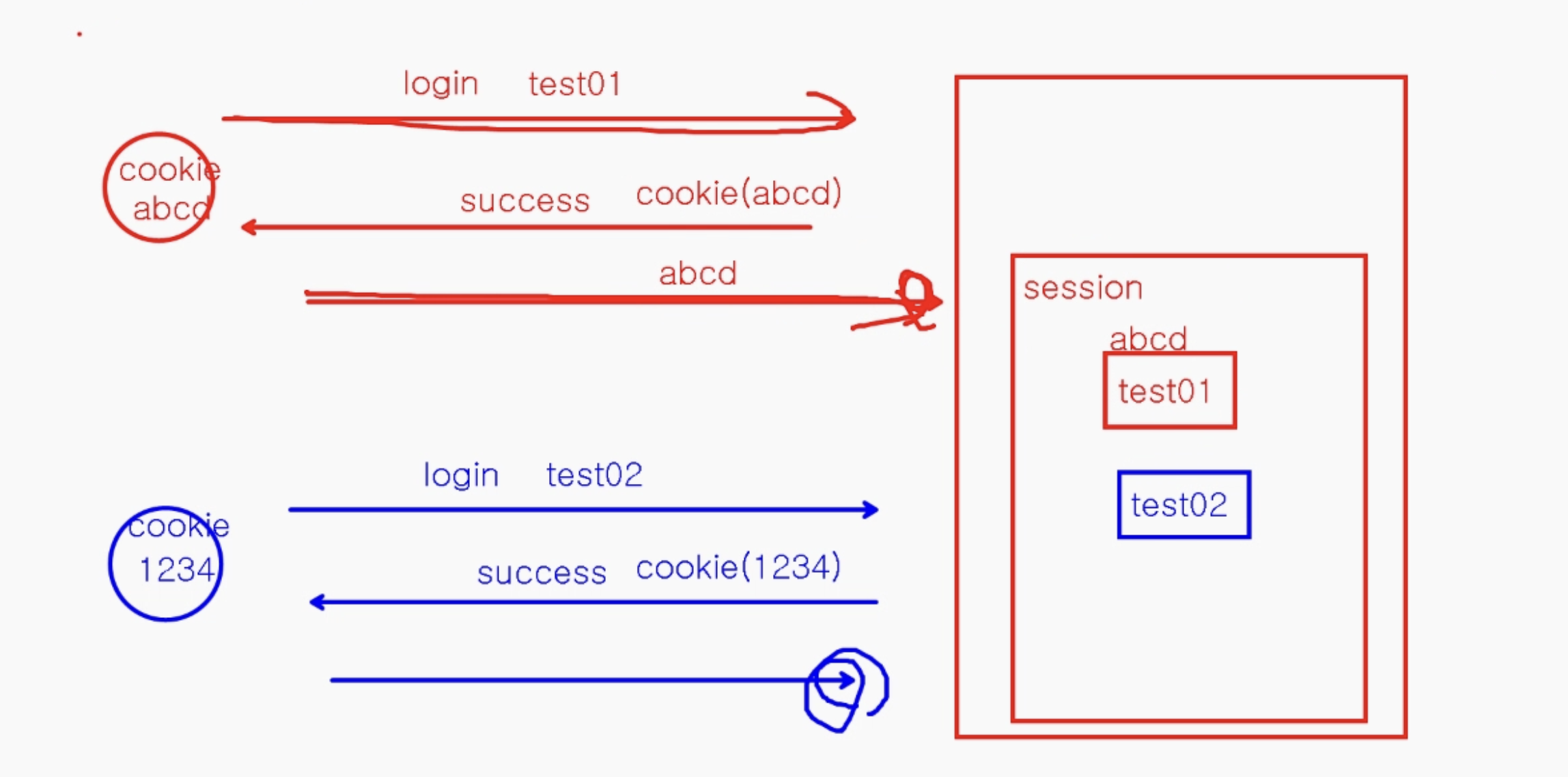 이후 요청시 쿠키값으로 세션을 확인하여 로그인 완료
