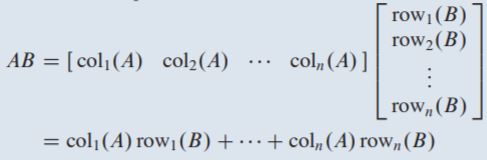 A를 m×n matrix, B를 b1,…,bp 의 column vector를 가진 n×p matrix라고 하였을때 product AB 는 m×p matrix이며 Ab1,…,Abp 를 column 으로 갖는다