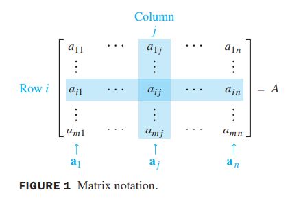 - m개의 rows와 n개의 columns를 갖은 m×n matrix의 ith row, jth column의 entry를 aij로 표기한다.