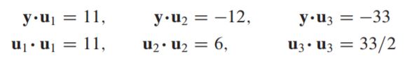 set S = {u1,u2,u3}이 위와 같고, orthogonal basis for R3일때 vector y = (6,1,-8)를 orthogoanl basis로 표현해보자.
