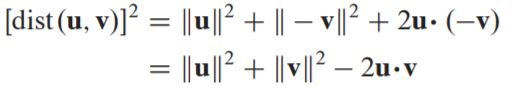 위 그림에서 distance from u to v 이 distance from u to −v랑 같다묜 이는 geometrically perpendicular하며 이 둘은 squares of distance가 같다.