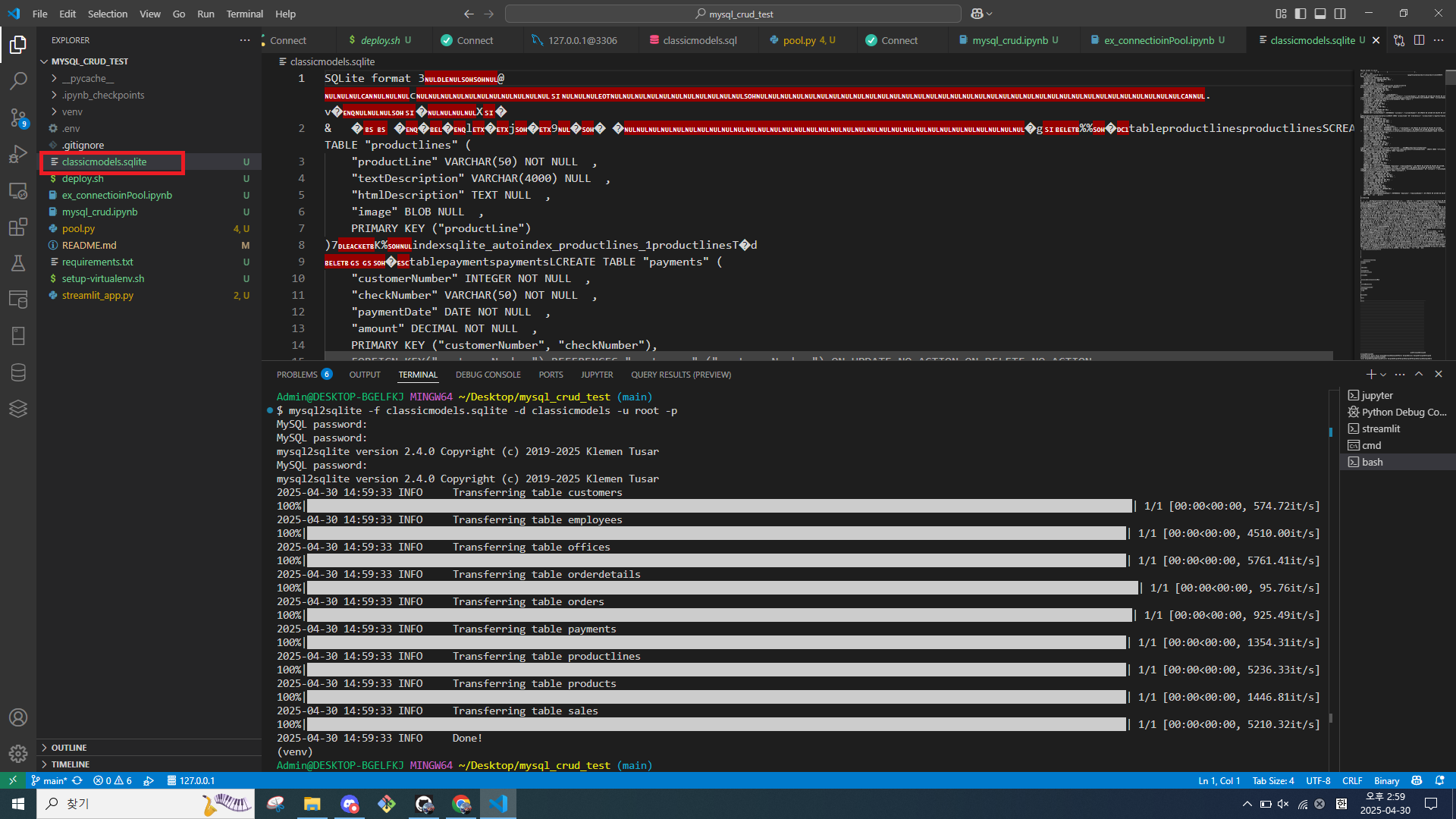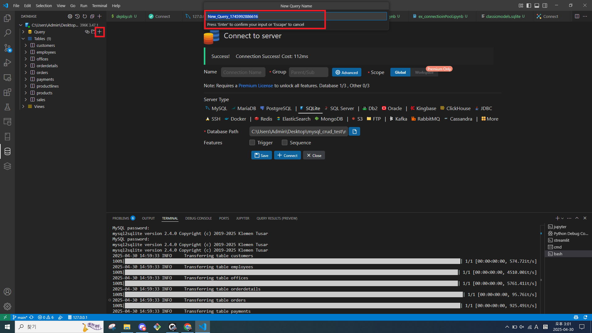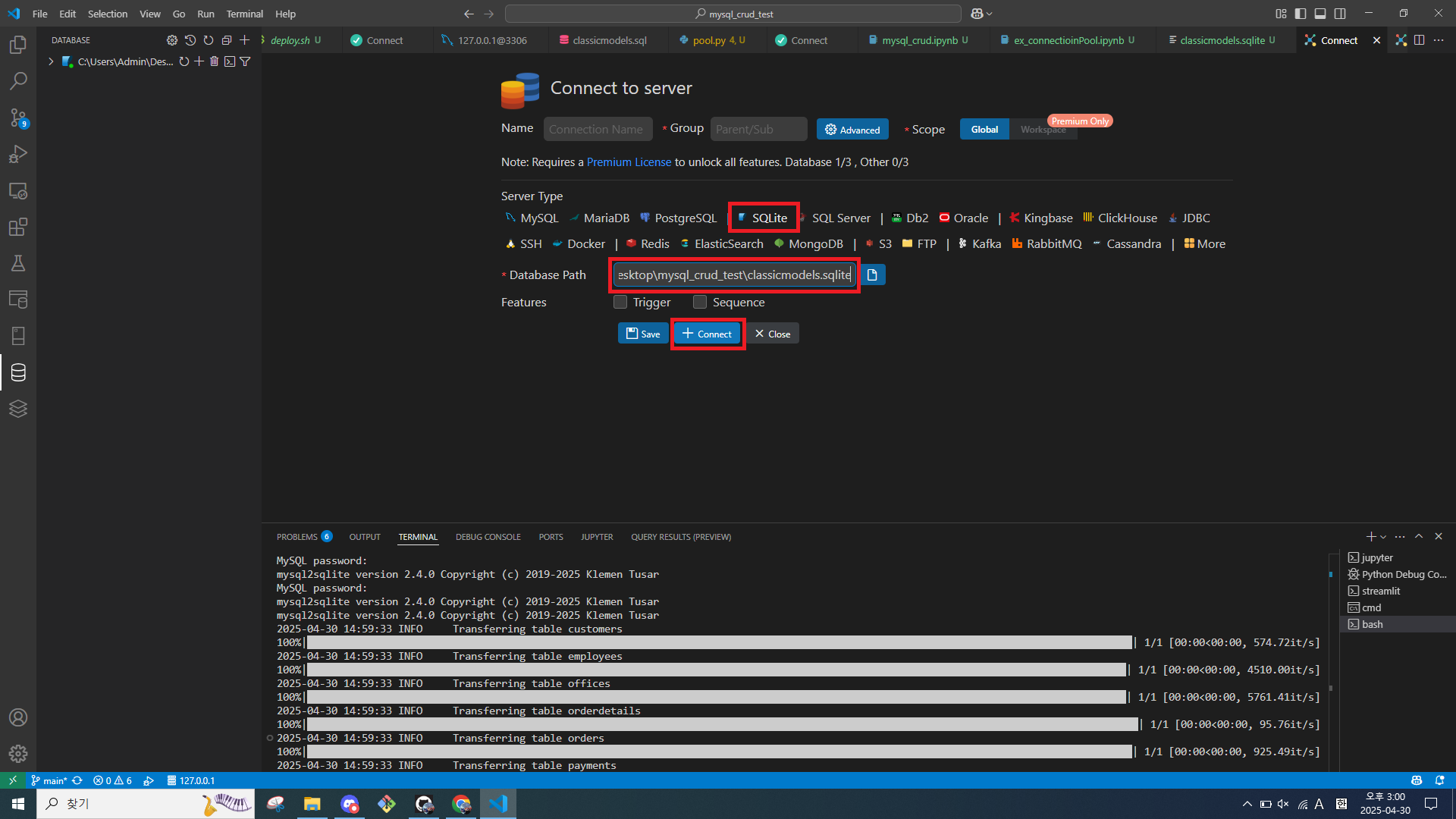 좌측 패널 Database에 classicmodels.sqlite DB 생성 확인