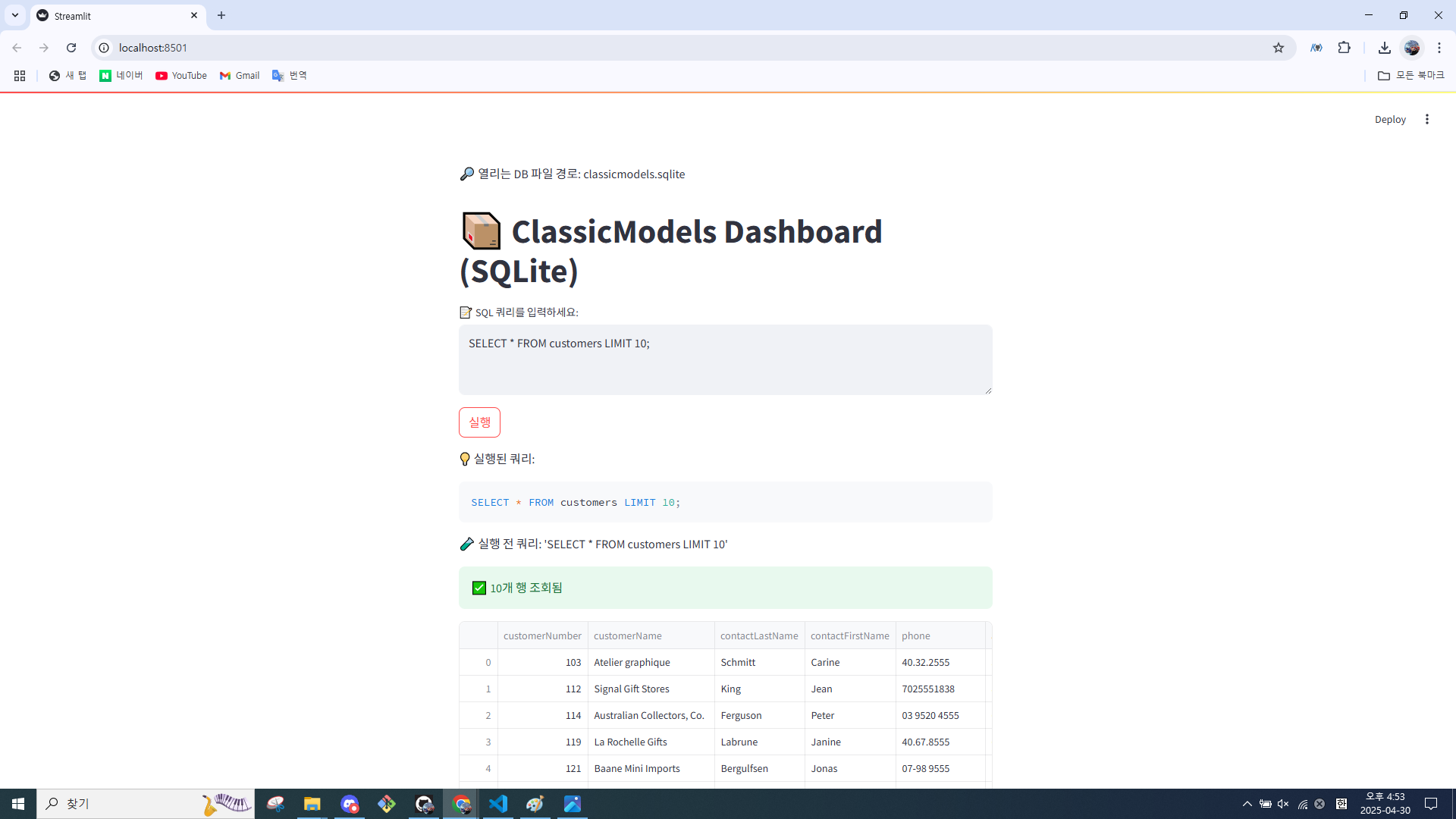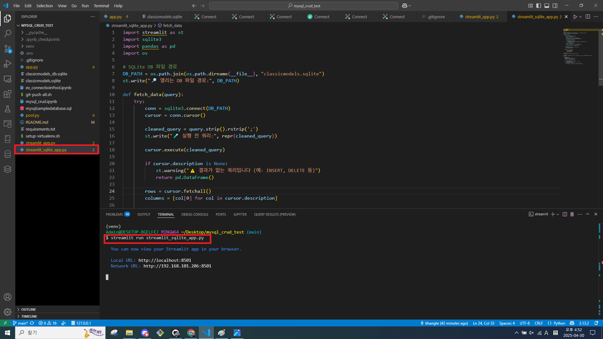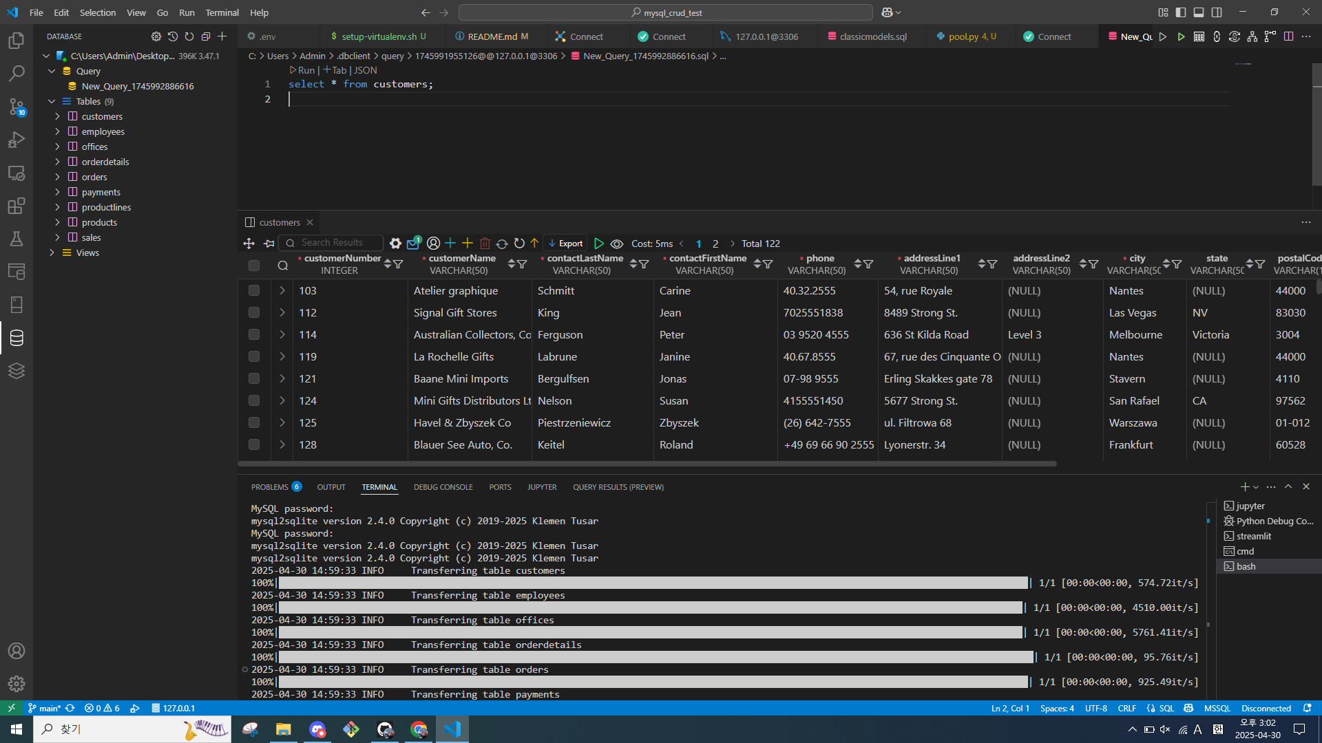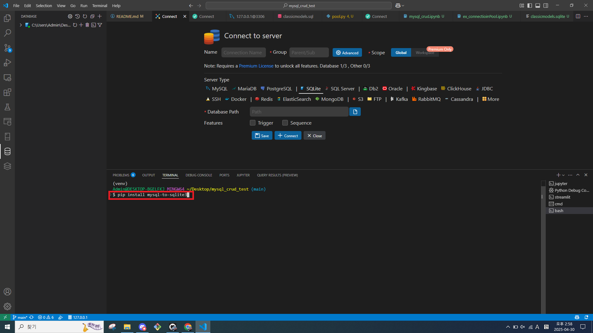 좌측 패널 Database에 classicmodels.sqlite DB 생성 확인