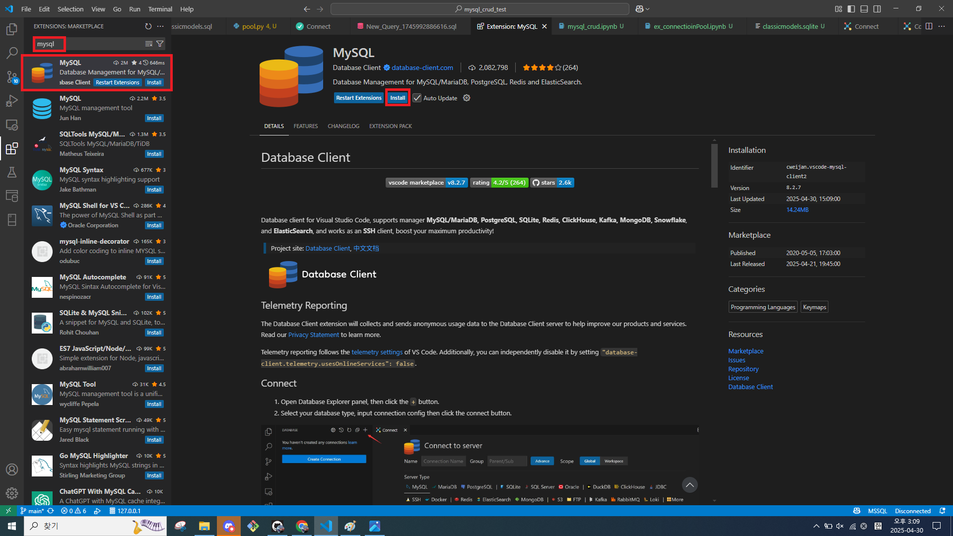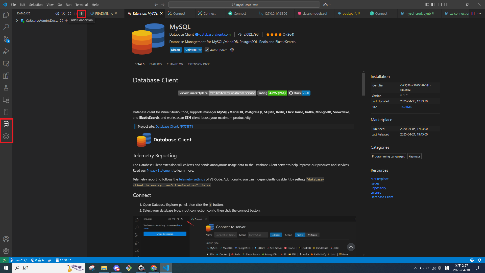 VSCode 좌측 패널 Extensions에서 MySQL 검색 후 MySQL Database Client 설치