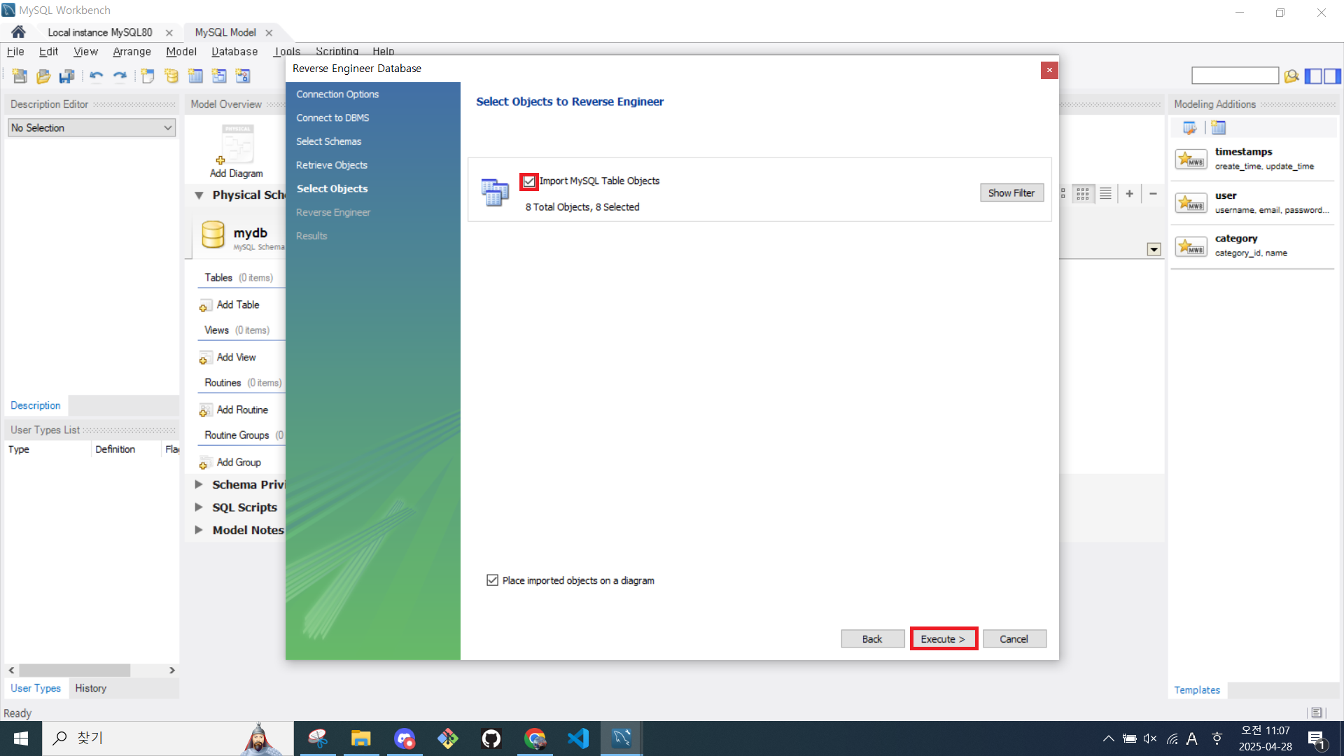 import MySQL Table Opjects 체크 확인 후, Execute 버튼 클릭