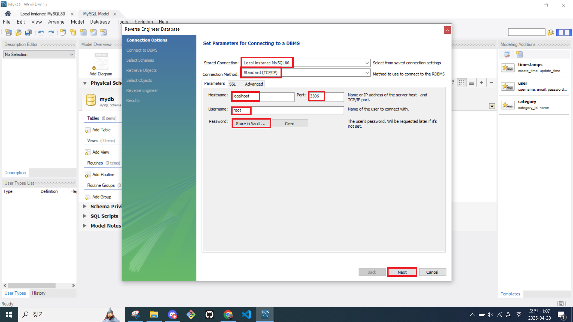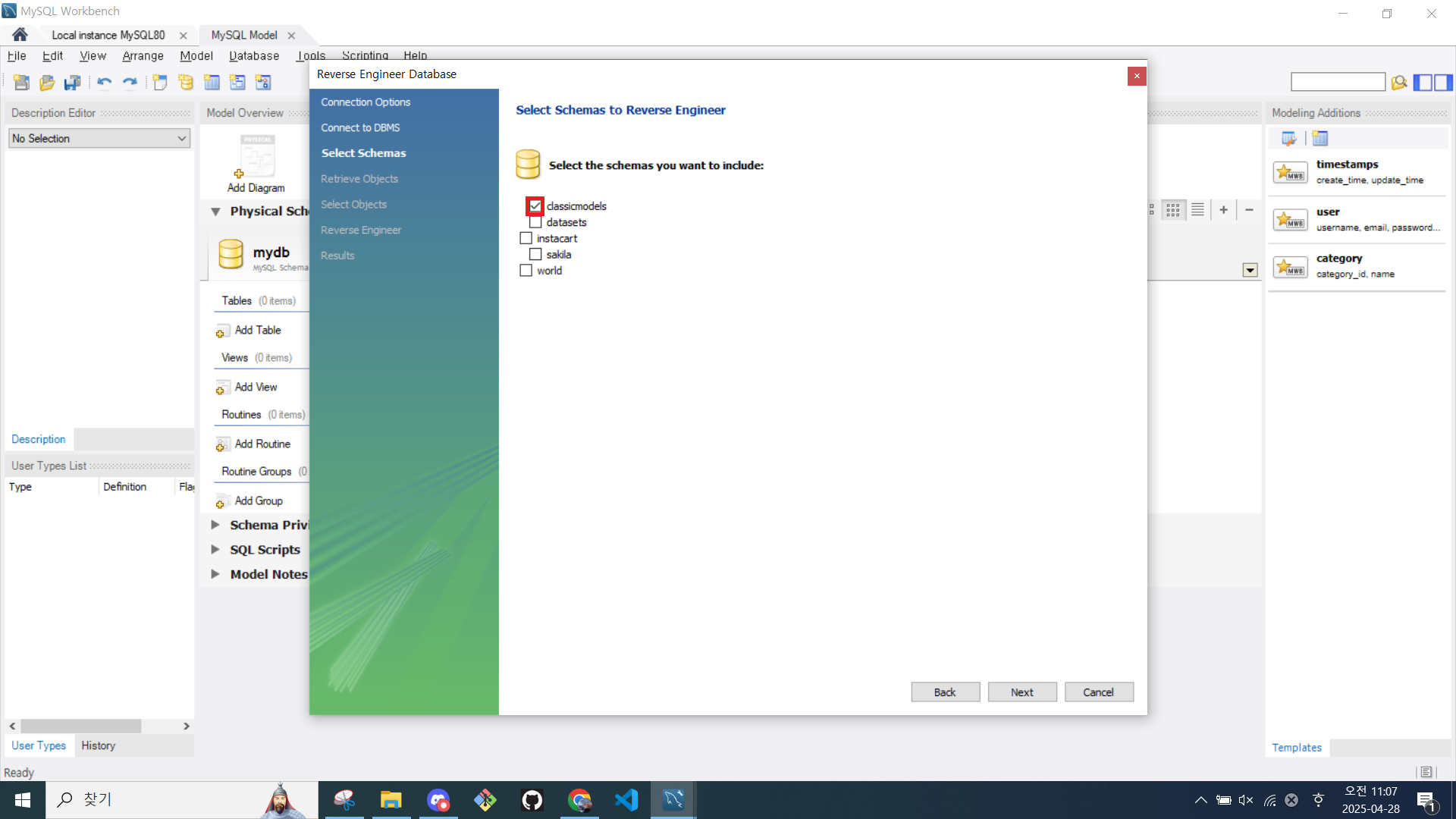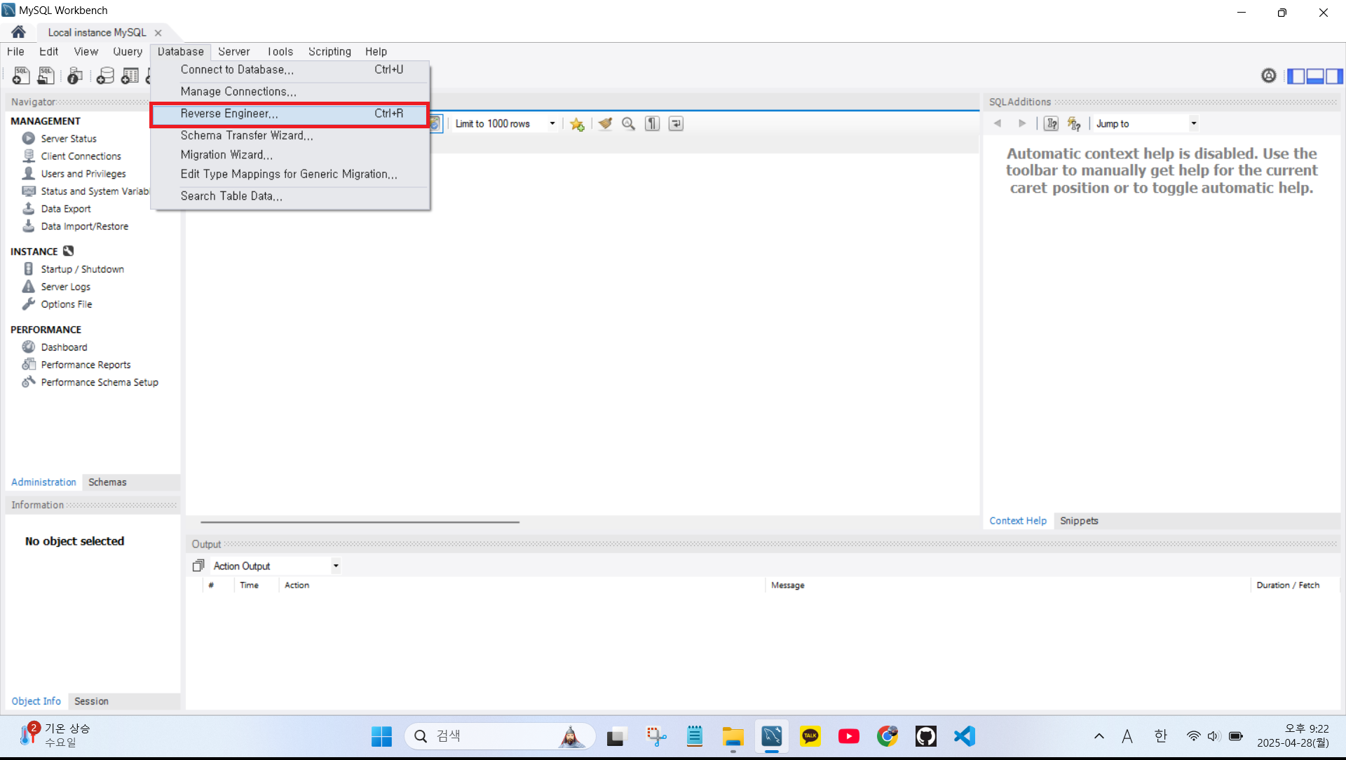 MySQL Workbench에 접속 후, 상단 패널의 Database -> Reverse Engineer... (DB 불러오기) 를 클릭한다.