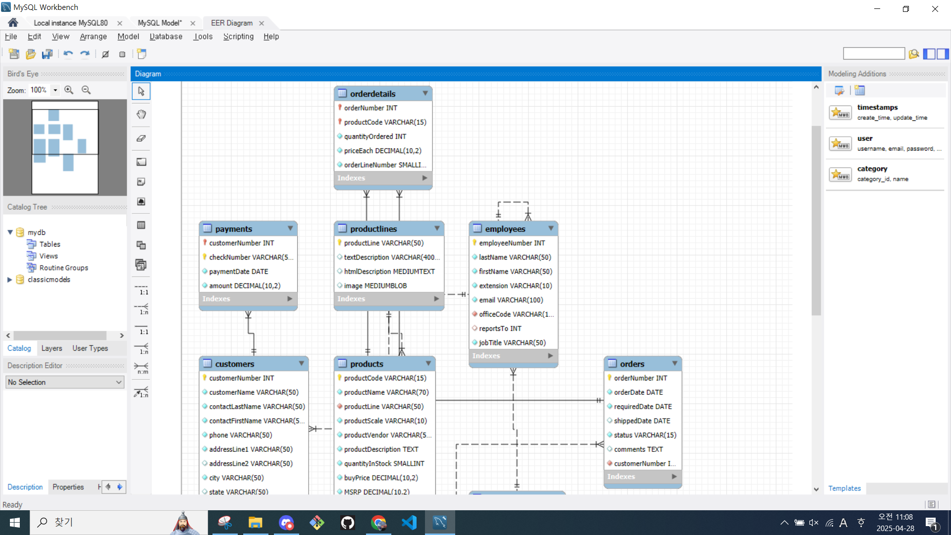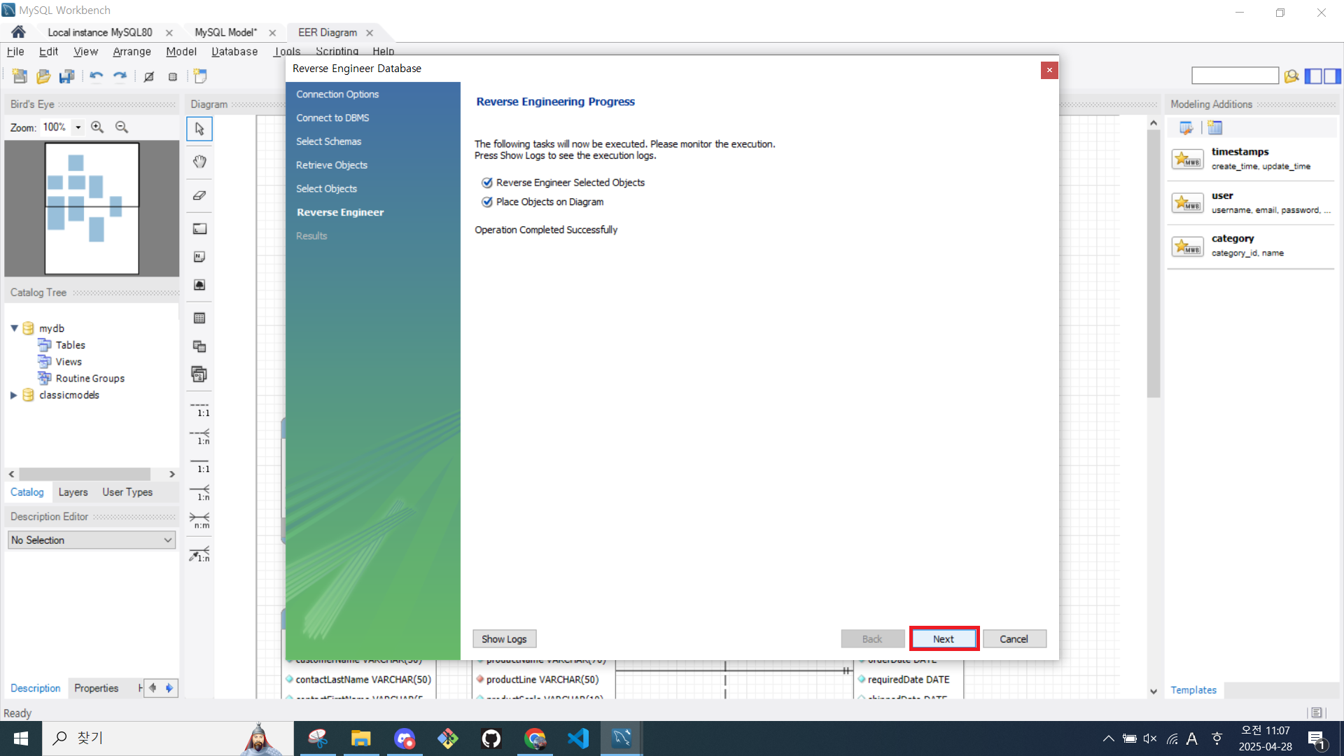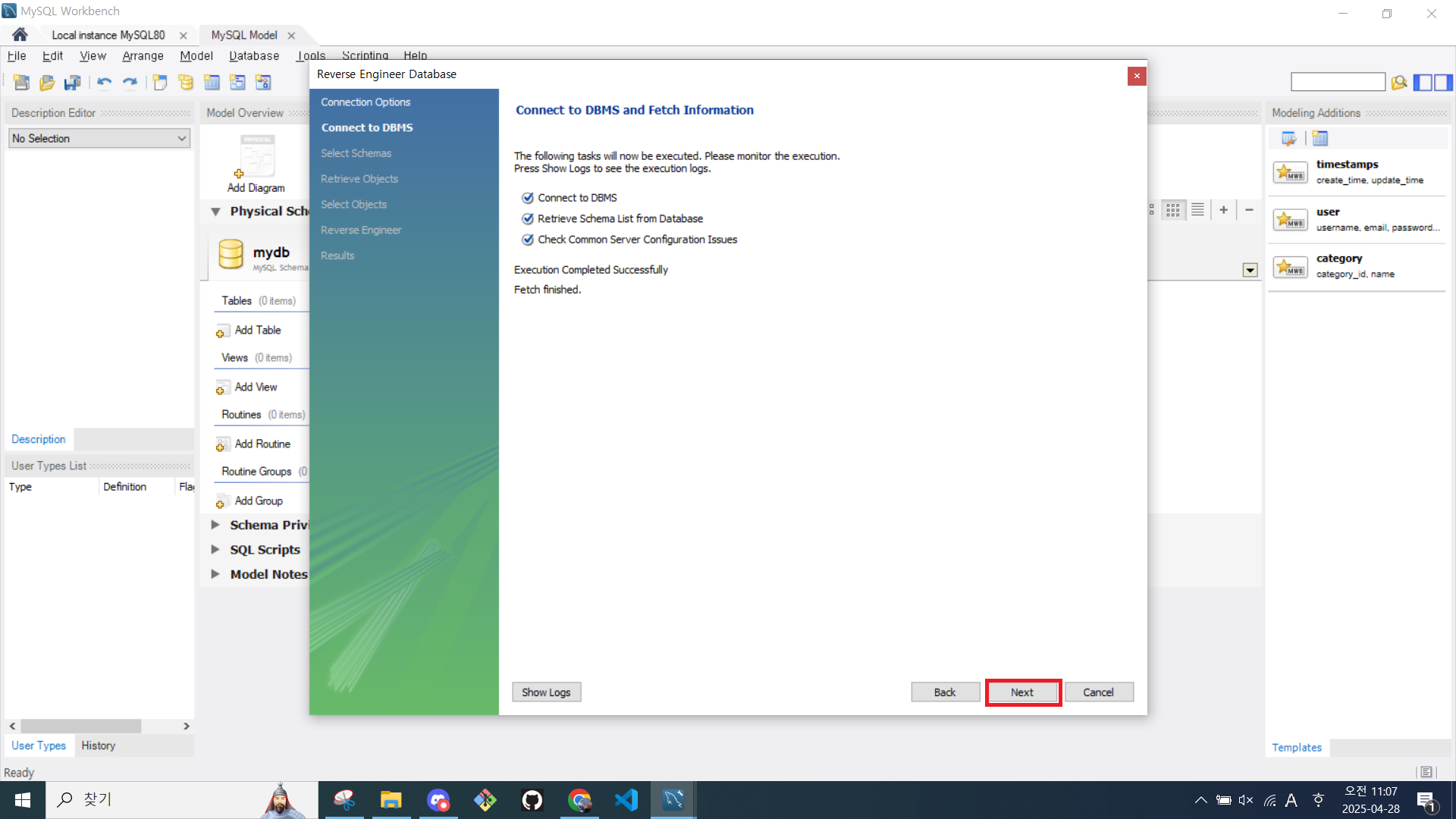 MySQL Workbench에 접속 후, 상단 패널의 Database -> Reverse Engineer... (DB 불러오기) 를 클릭한다.
