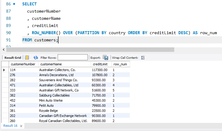 , ROW_NUMBER() OVER (PARTITION BY country ORDER BY creditLimit DESC) AS row_num