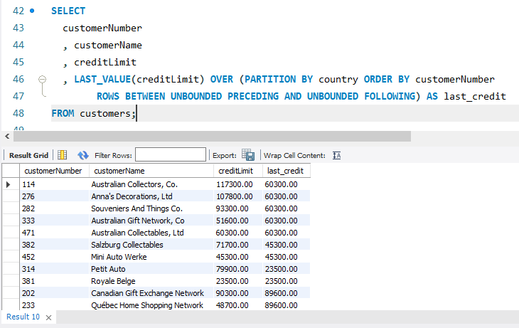 , LAST_VALUE(creditLimit) OVER (PARTITION BY country ORDER BY customerNumber