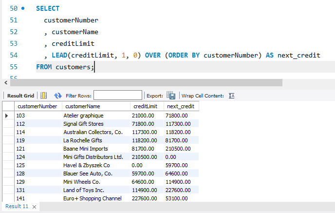 , LEAD(creditLimit, 1, 0) OVER (ORDER BY customerNumber) AS next_credit