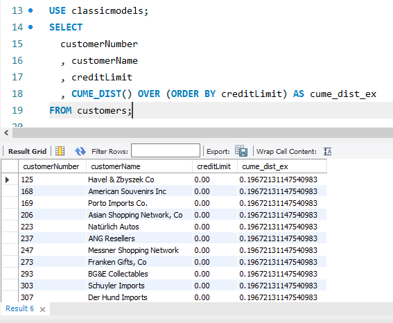 , CUME_DIST() OVER (ORDER BY creditLimit) AS cume_dist_ex