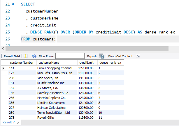 , DENSE_RANK() OVER (ORDER BY creditLimit DESC) AS dense_rank_ex