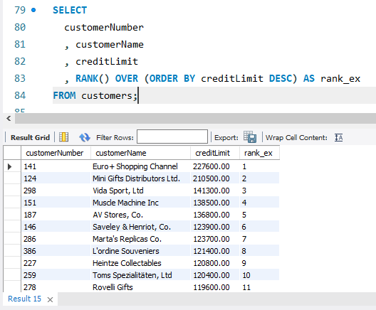 , RANK() OVER (ORDER BY creditLimit DESC) AS rank_ex