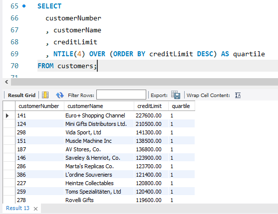 , NTILE(4) OVER (ORDER BY creditLimit DESC) AS quartile