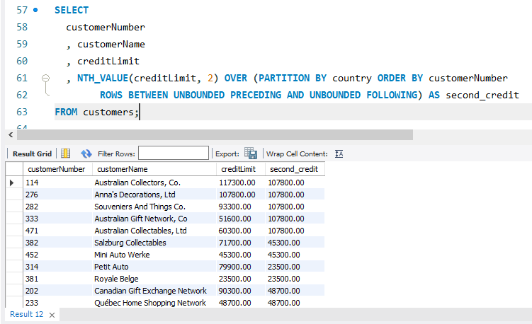 , NTH_VALUE(creditLimit, 2) OVER (PARTITION BY country ORDER BY customerNumber